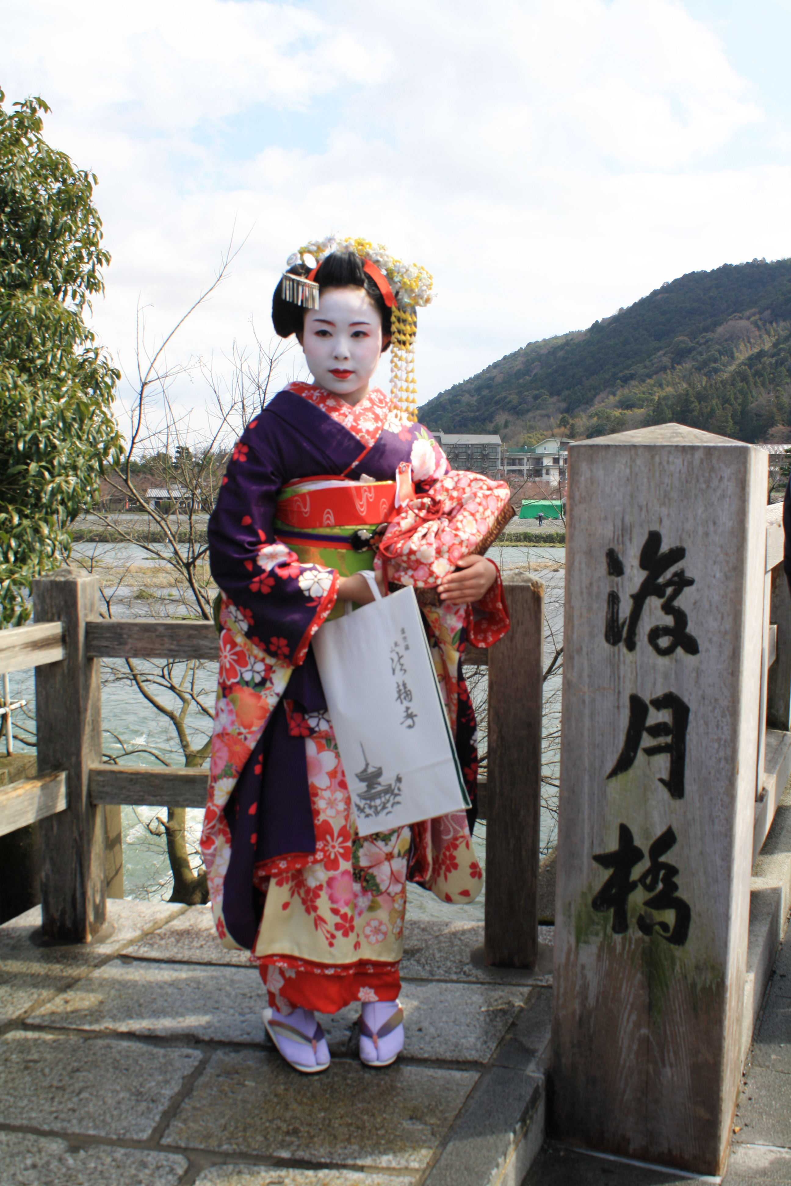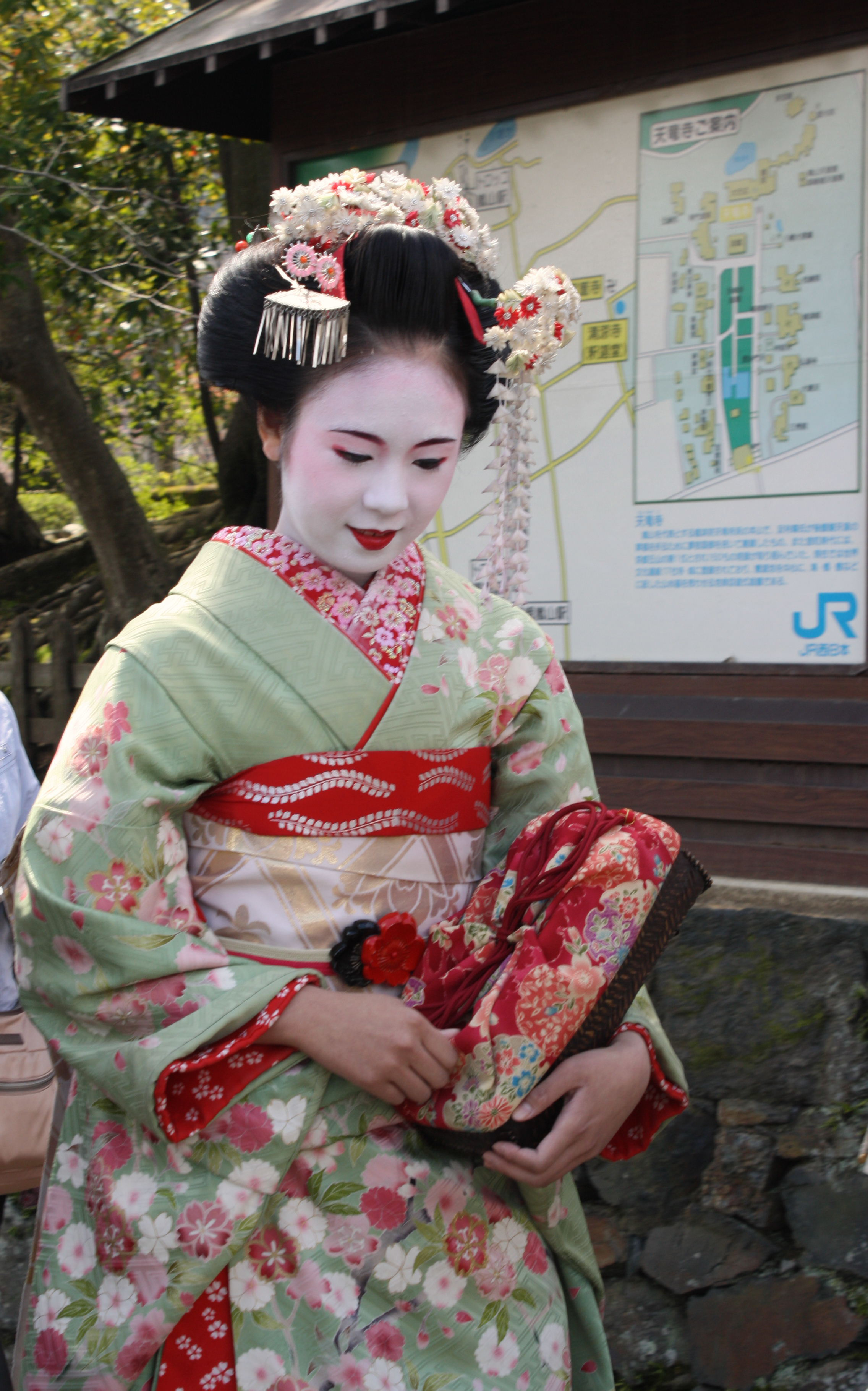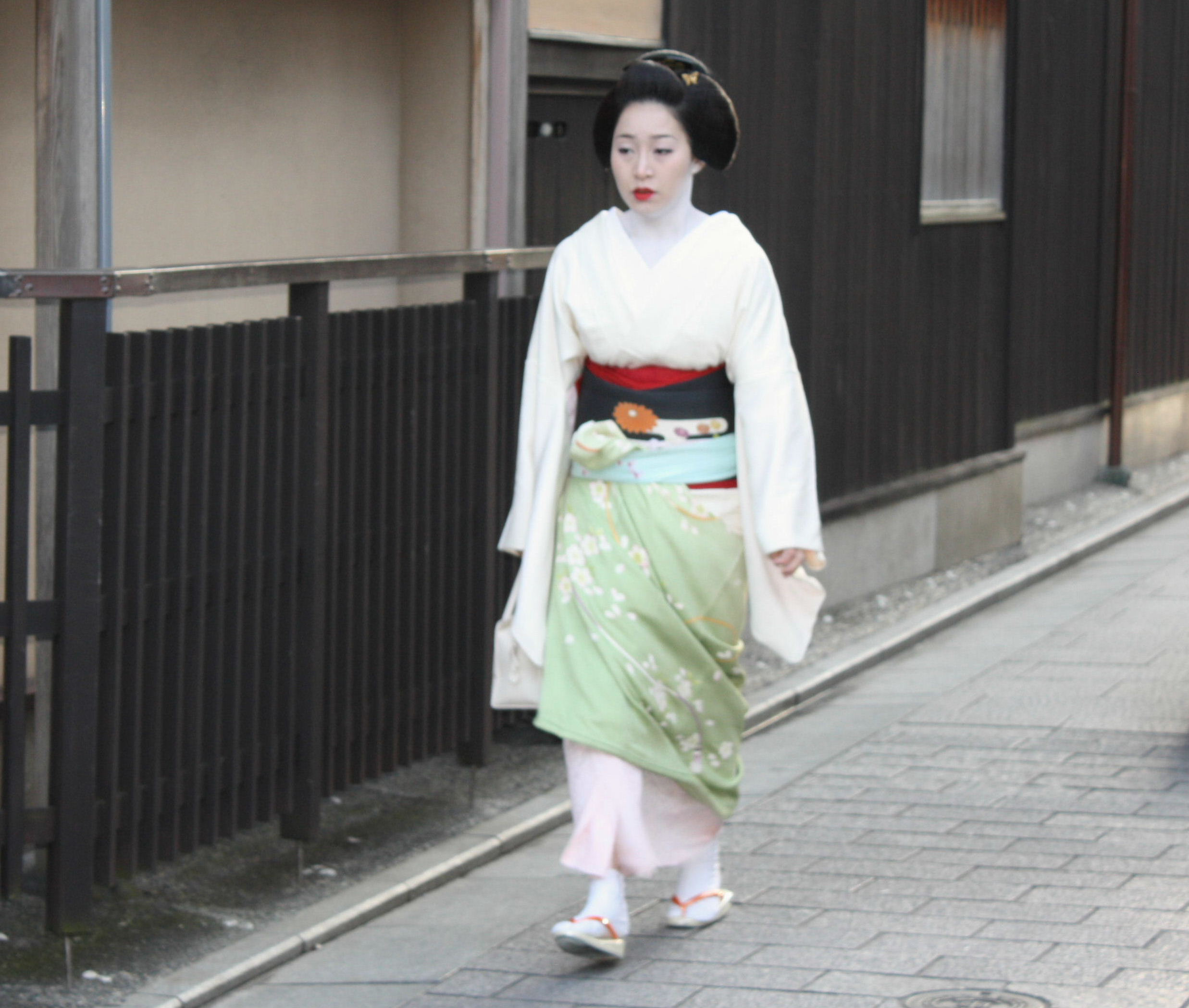 This rather young Maiko looks like she is bearly 15 which is the allowable age in Kyoto. In modern Japanese labour laws, it is legal to become geisha apprentices only at the age of 18. It used to be that girls as young as 11 or 12 would be taken in as apprentices for training, as perfection was what they aimed for in order to please their paying guests.