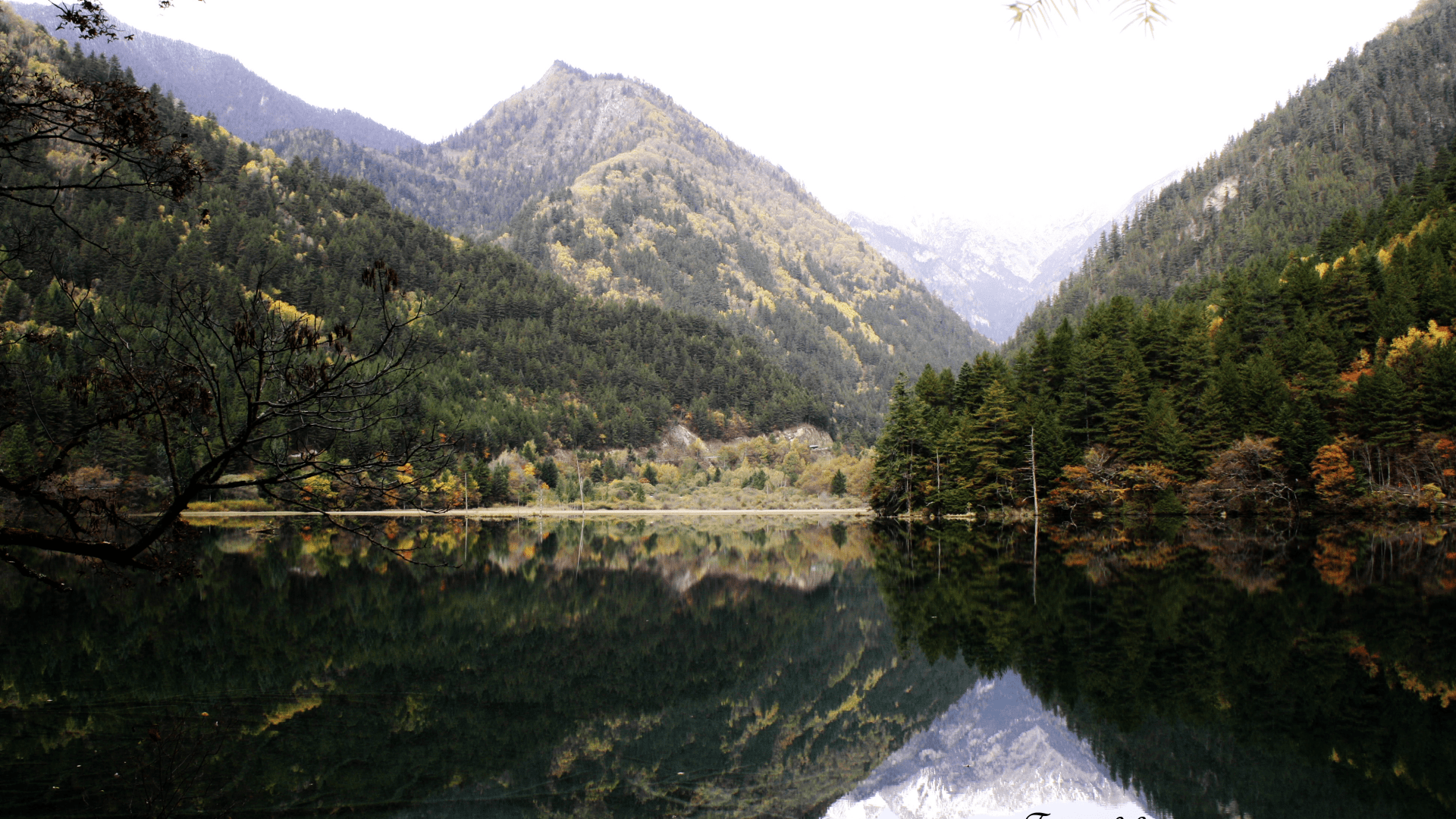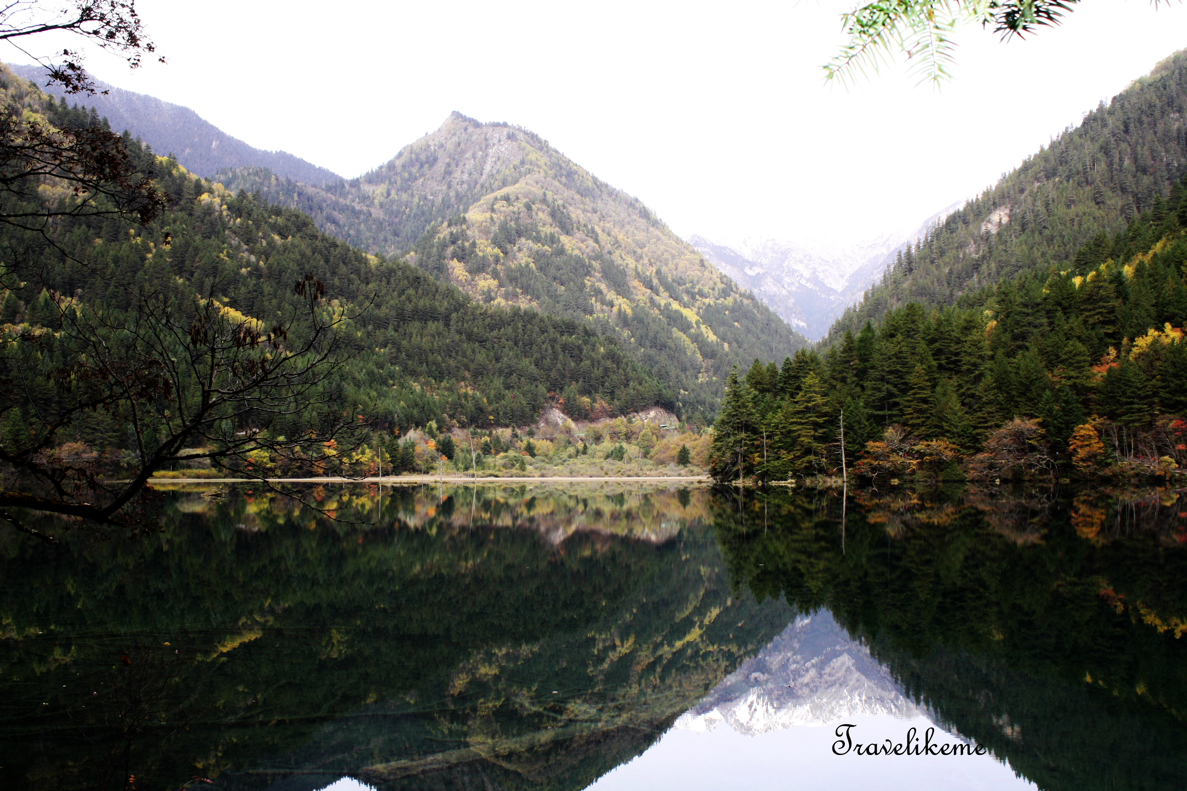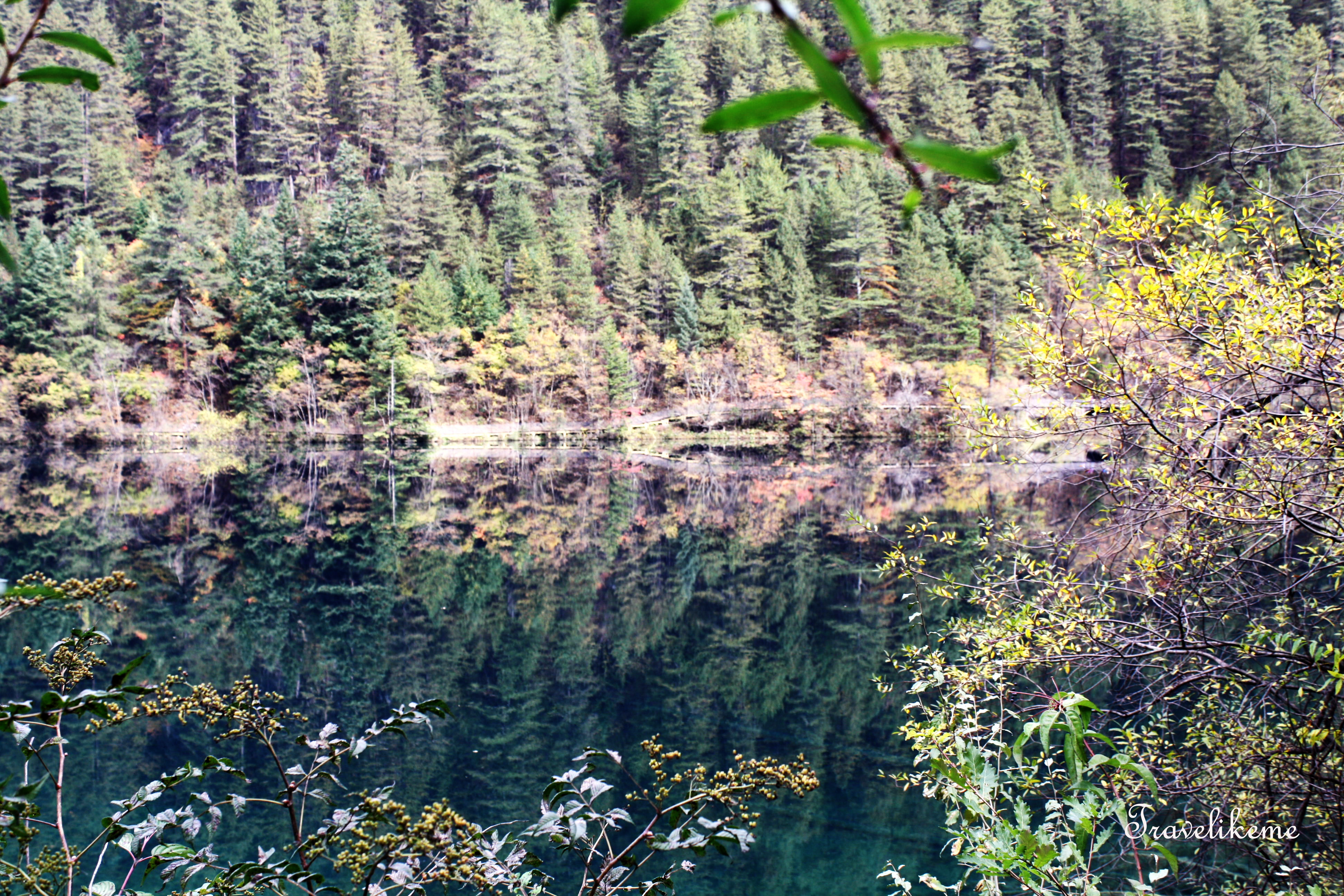 Mirror Lake lies 2390m above sea level, stretching 925m in length, 212.8m in width & 10.96m in depth. Jiuzhai Valley National Park, Szechuan Province, ChinaOn a still morning such as this, the beautiful reflection of the mountains, valley & even the flying birds are clearly seen on the lake’s surface & hence its namesake … Mirror Lake!Mirror Lake was formed by rock & mud slides flowing into the valley from glacial activity. The water is crystal clear & greenish in colour & a high concentration of calcium carbonate is present