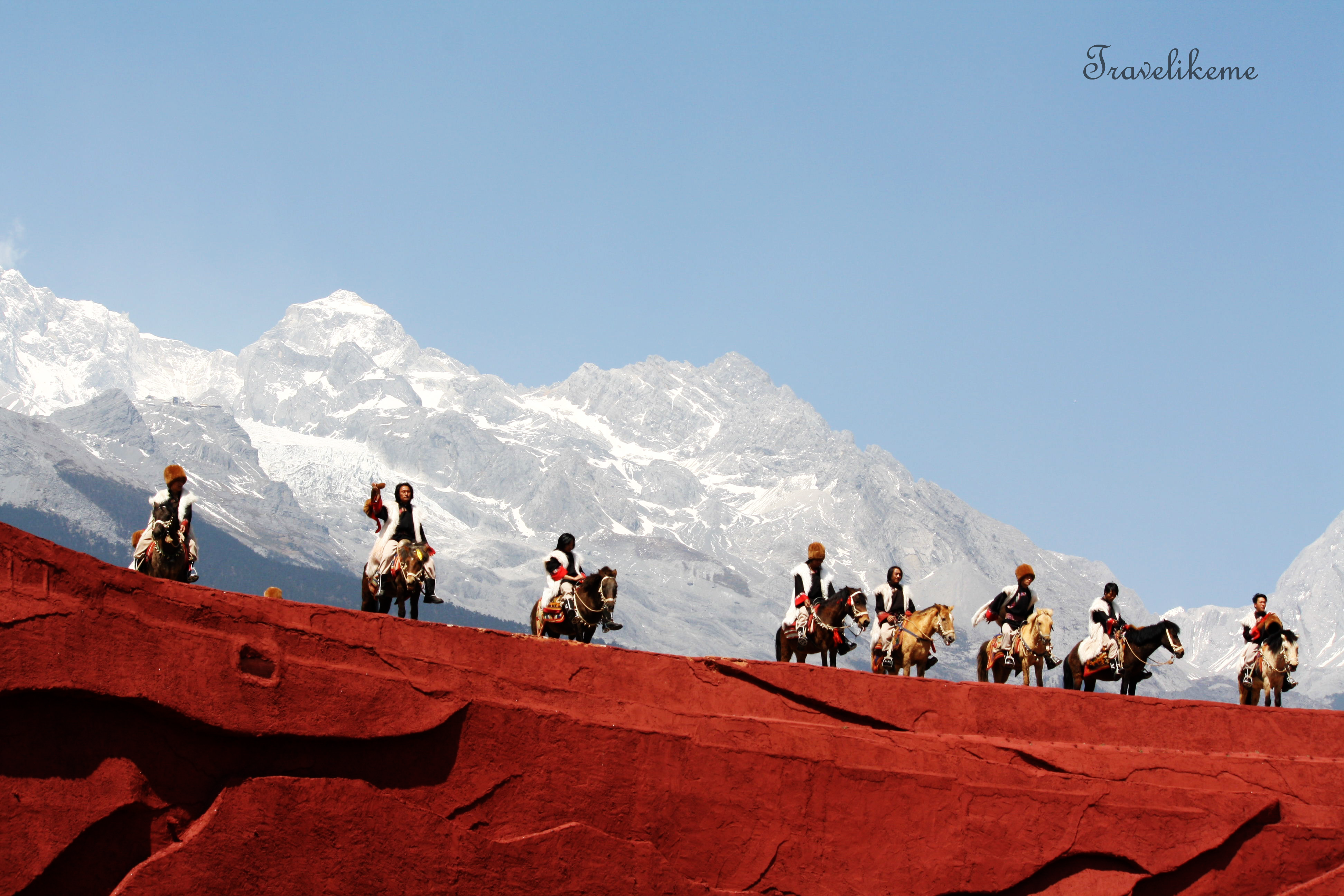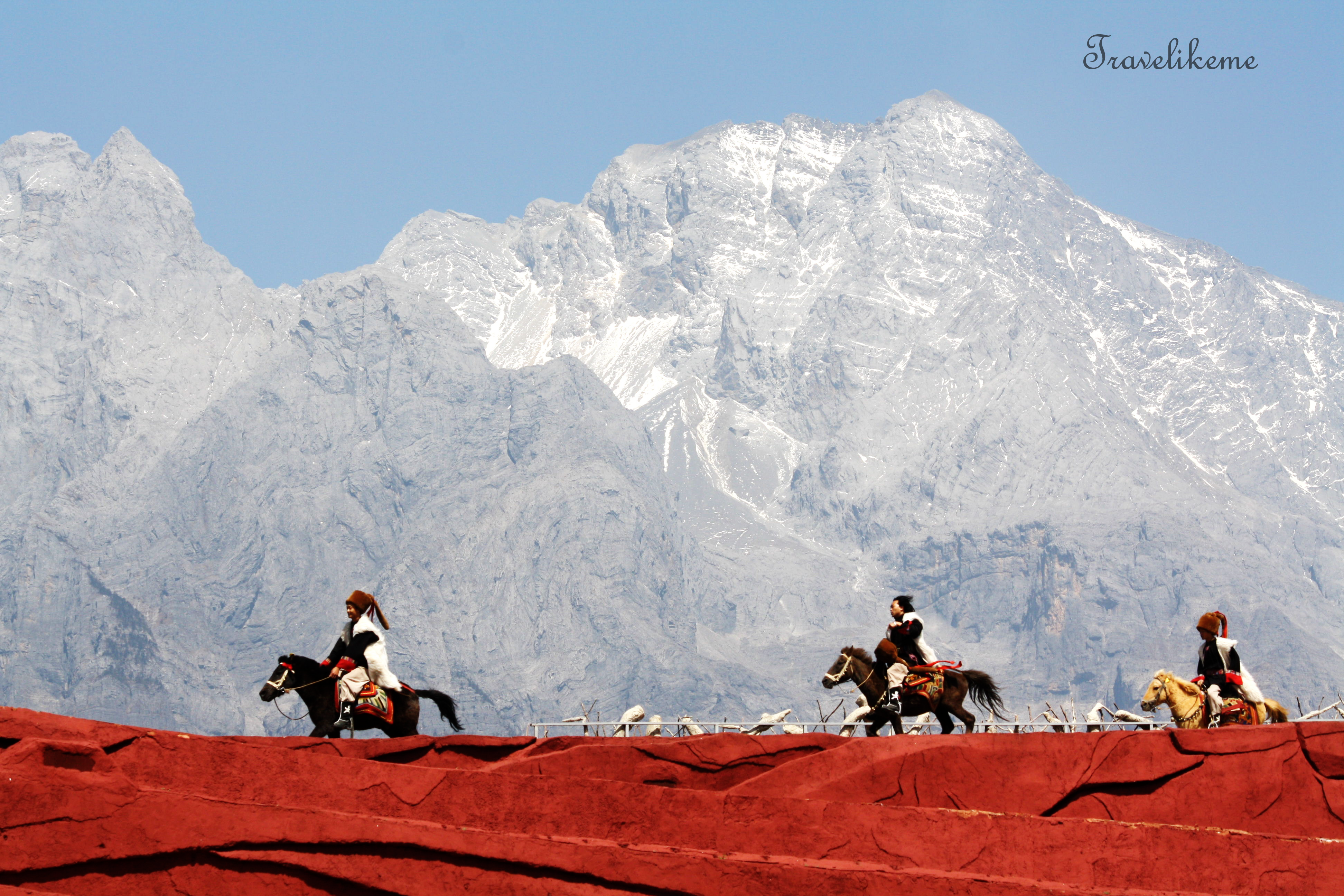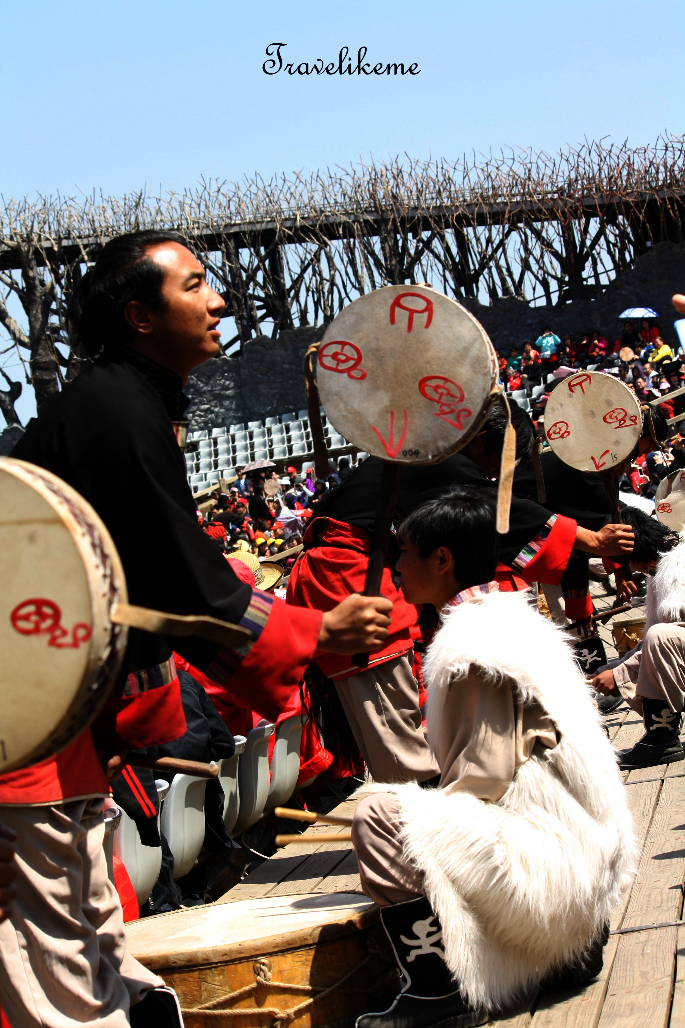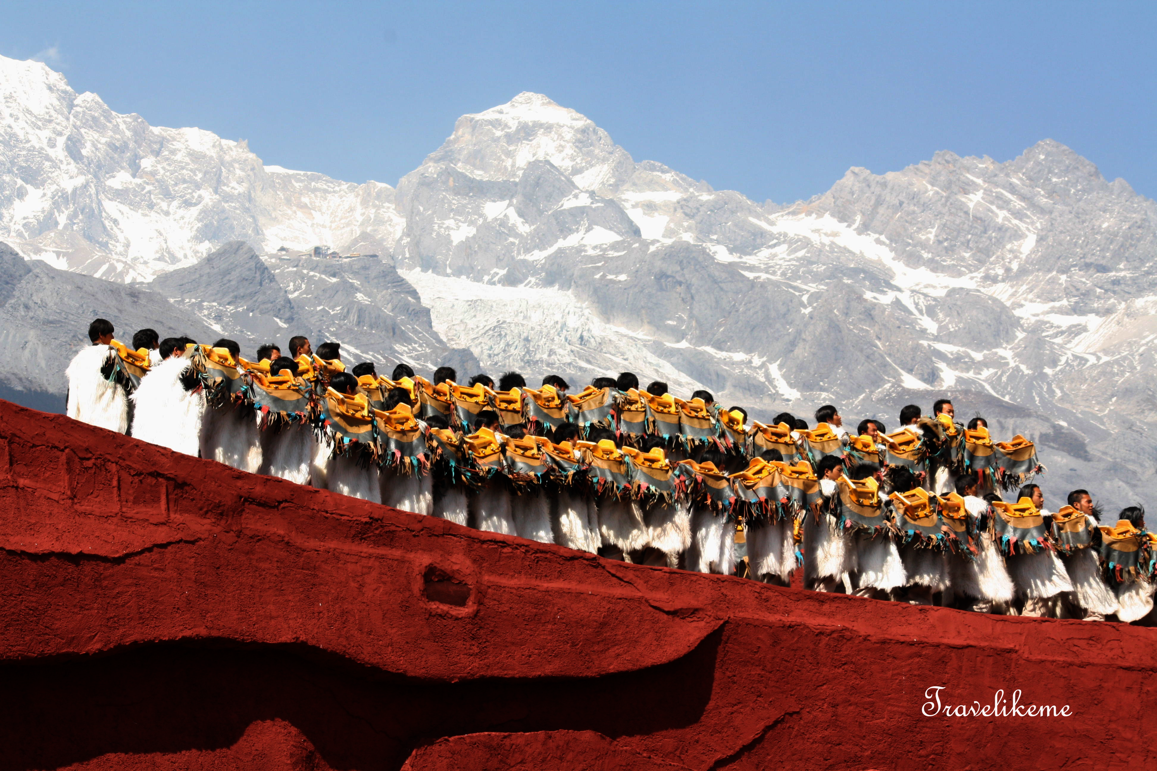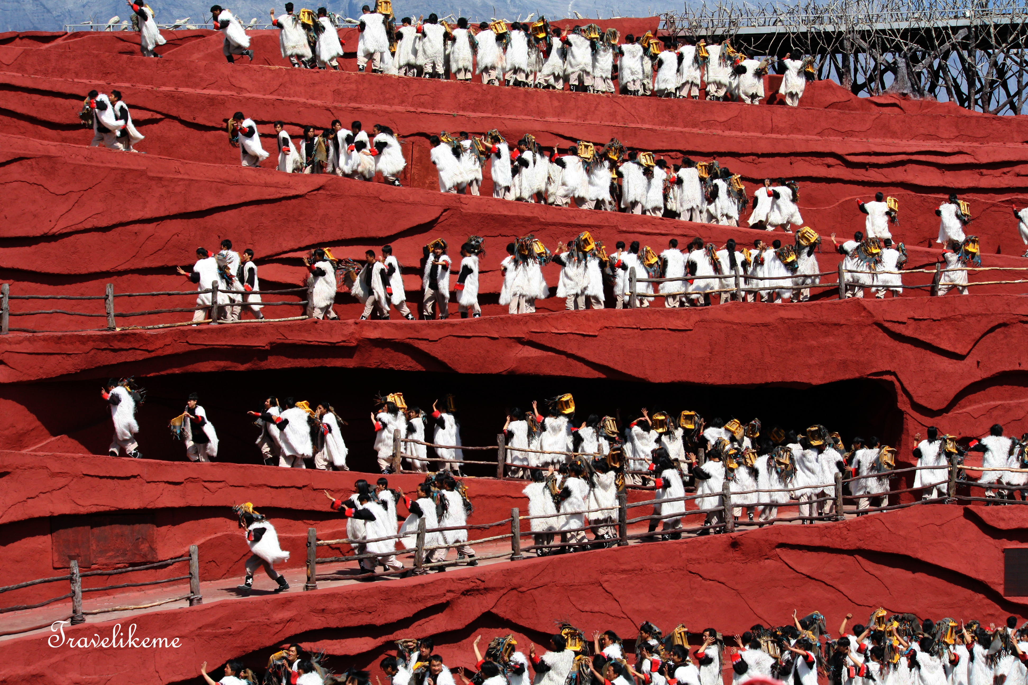 This is an entertaining 1 hour show set in an open air dome-like theatre in Lijiang, Yunnan Province, ChinaThere is singing & dancing that showcases the diverse cultures of the minority peoples of the People’s Republic of ChinaI like the music which was dramatic at most times interspersed with a few hauntingly beautiful songsThe magnificent Jade Dragon Snow Mountain serves as the backdrop of this musical extravaganzaA peripheral track runs on top of the domeThe cast is made up of Lisuo, Bai, Dai, Naxi, Mosuo & Han peoplesThis grand scaled outdoor performance features a large cast of as many as 200 peopleLijiang Impression is the brainchild of famous Chinese film director Zhang Yimou, who incidentally also choregraphed the Beijing Olympics in 2008The 360 degrees stage is unique in that it is built in a high altitude venue & is at the foot of a mountainA slow march up this interestingly tiered stageThe music, the cast, the background, the costumes, the sun & the cold air ~ makes this a sensory feastThe crowds let out a gasp, as the horsemen make their sudden entry into the domeGalloping round the domePosing for the adoring crowdAcrobatic horsemenTheir costumes vary according to their different tribesLove their colourful costumes & diversityThe tribal songs they sing are usually in the pentatonic scaleA quiet moment as they sing a tribal song in acapellaLove this segment best, when the drummers made their way amongst the spectatorsA powerful & mesmerizing drum performance towards the end of the show