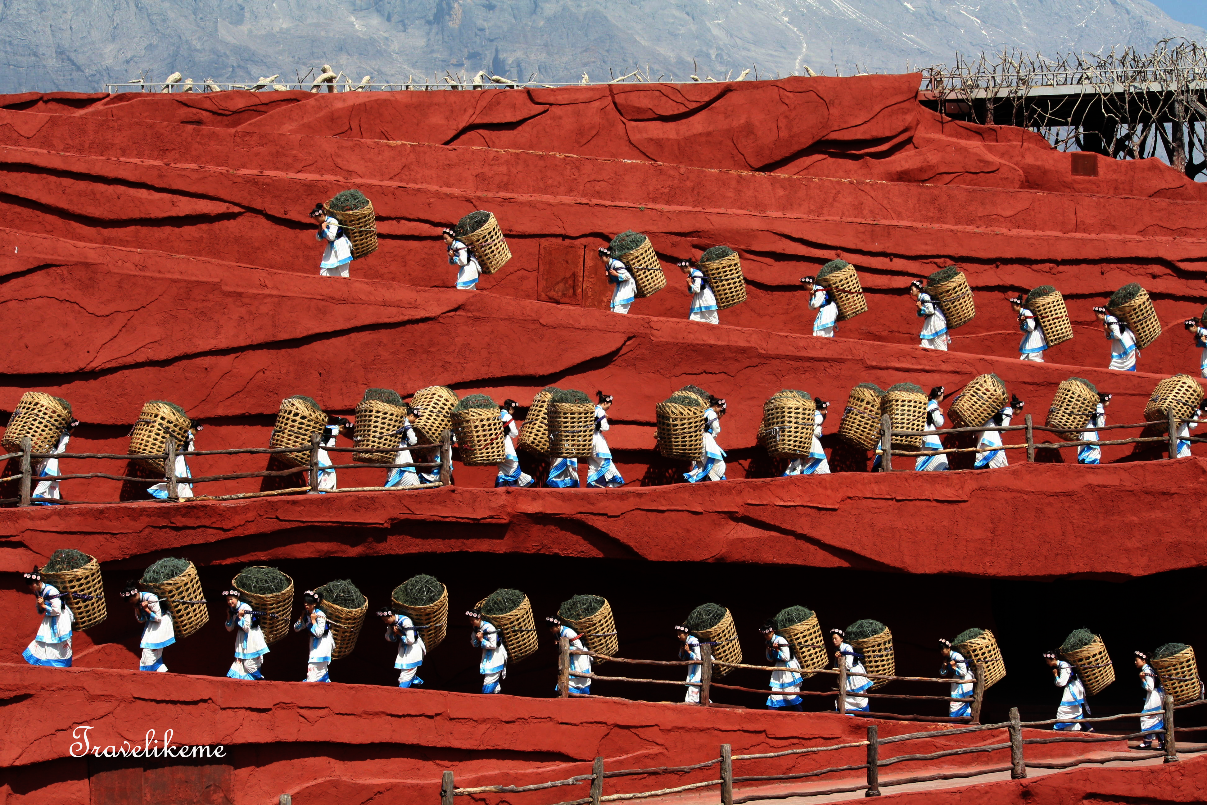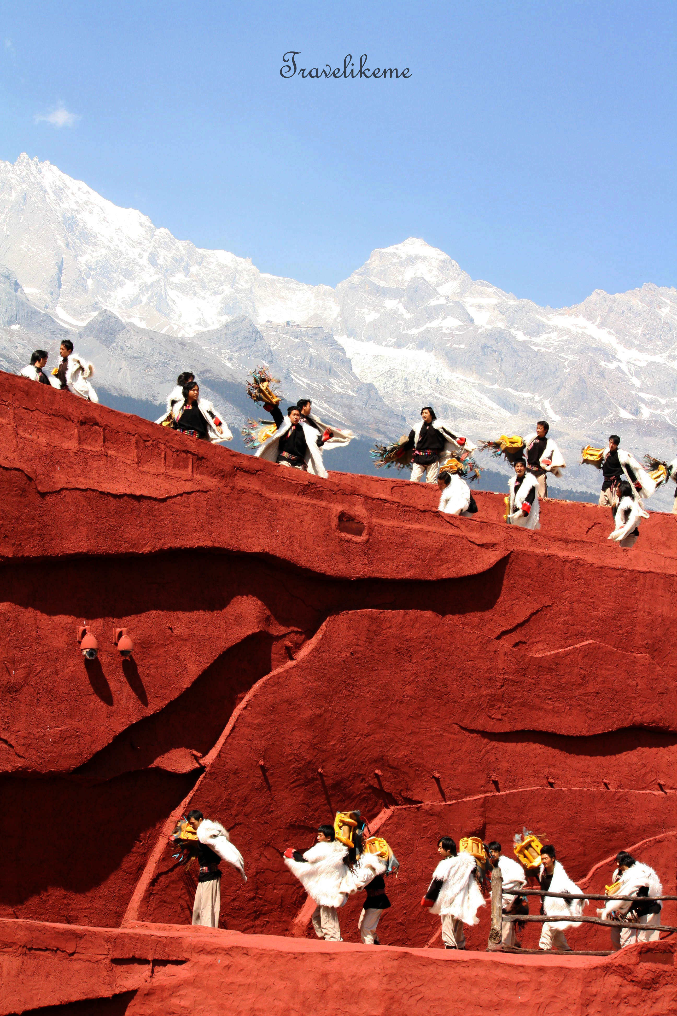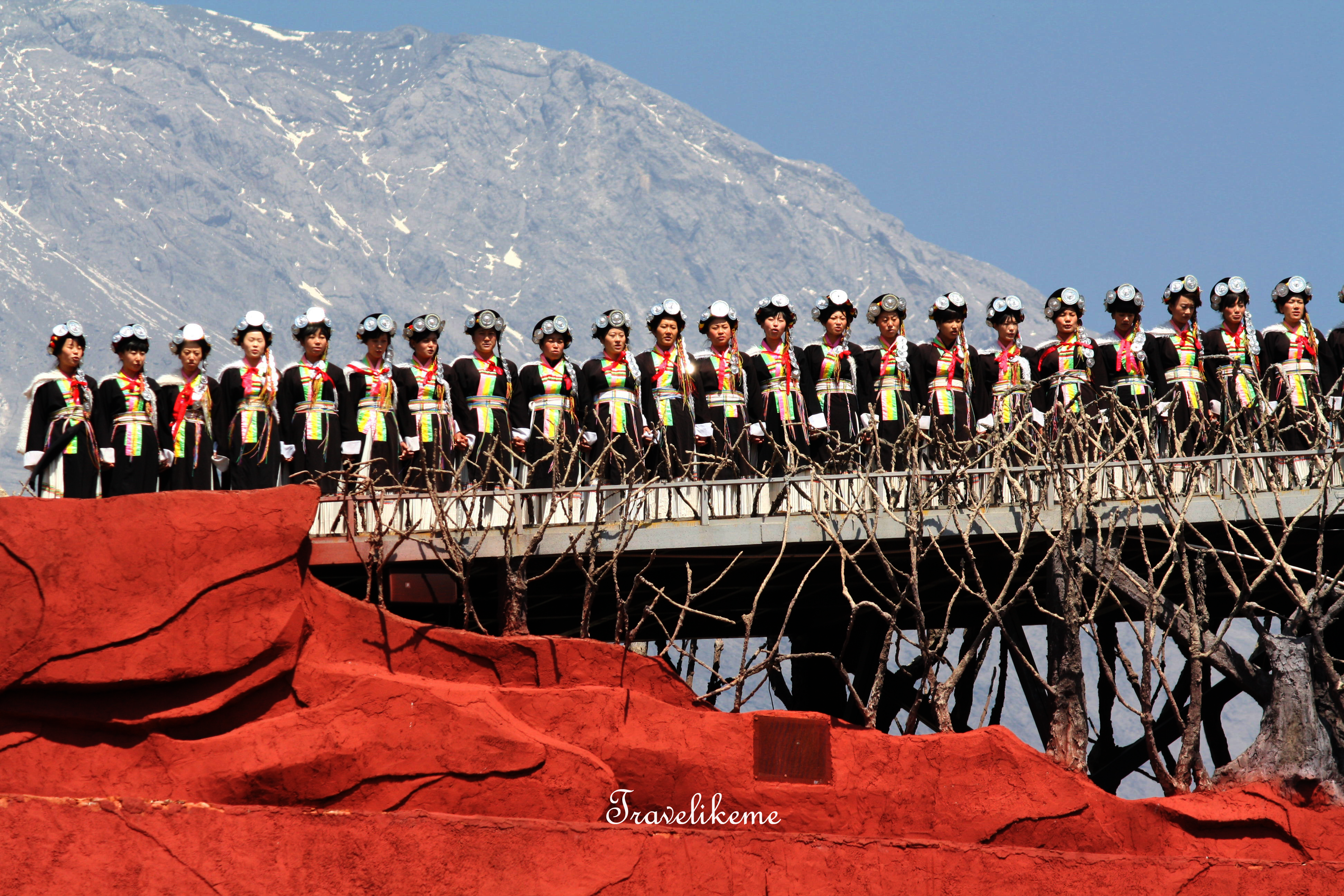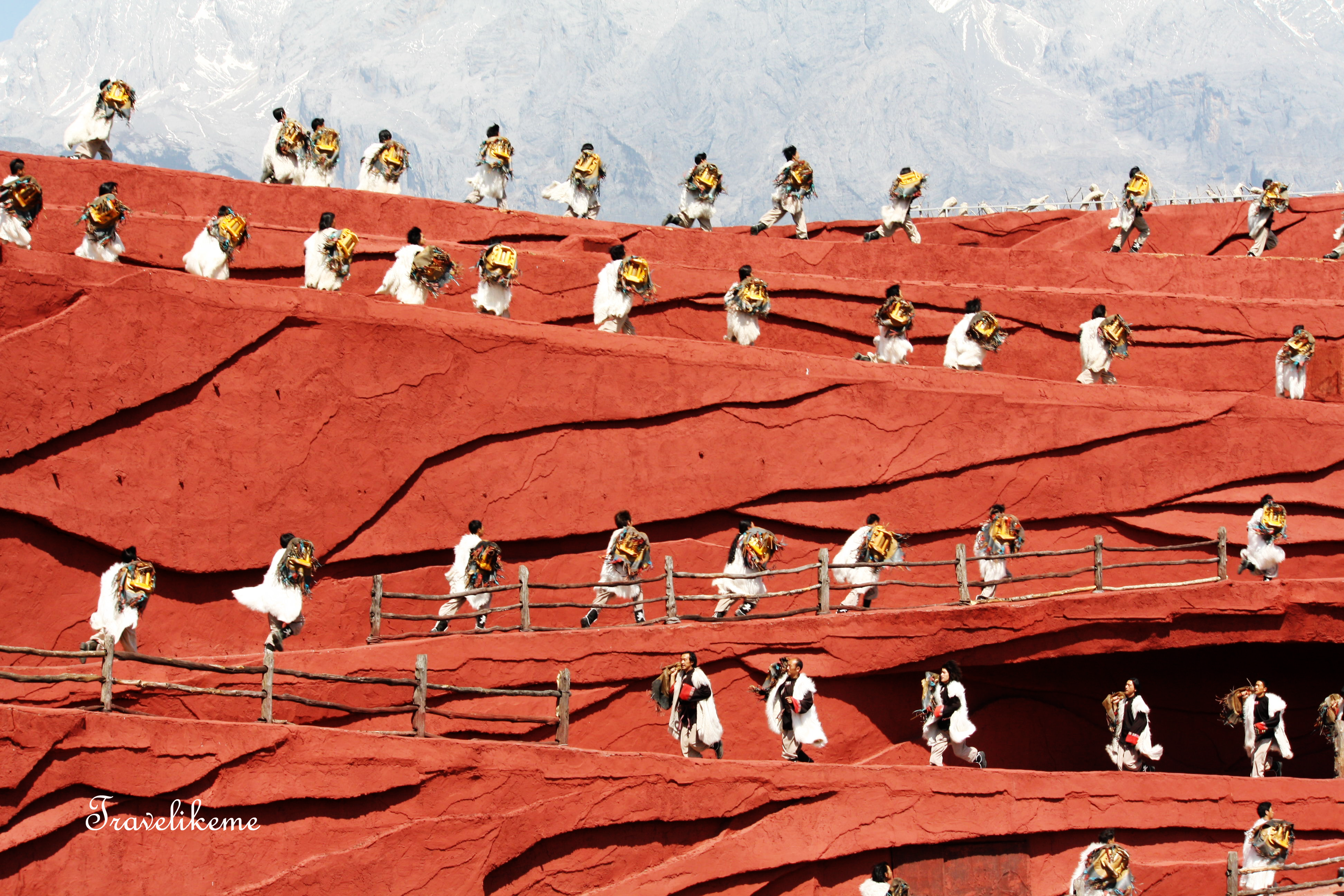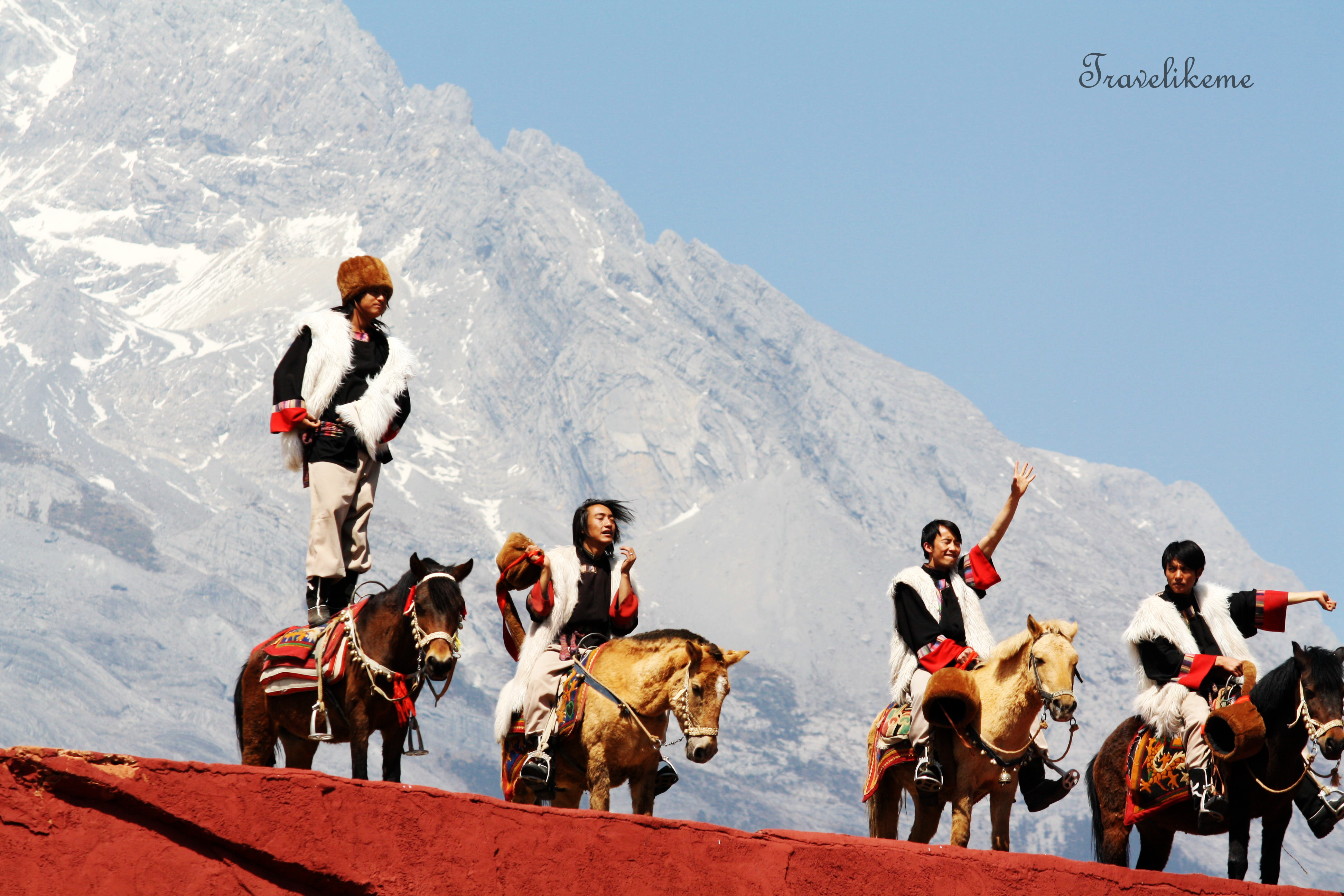 This is an entertaining 1 hour show set in an open air dome-like theatre in Lijiang, Yunnan Province, ChinaThere is singing & dancing that showcases the diverse cultures of the minority peoples of the People’s Republic of ChinaI like the music which was dramatic at most times interspersed with a few hauntingly beautiful songsThe magnificent Jade Dragon Snow Mountain serves as the backdrop of this musical extravaganzaA peripheral track runs on top of the domeThe cast is made up of Lisuo, Bai, Dai, Naxi, Mosuo & Han peoplesThis grand scaled outdoor performance features a large cast of as many as 200 peopleLijiang Impression is the brainchild of famous Chinese film director Zhang Yimou, who incidentally also choregraphed the Beijing Olympics in 2008The 360 degrees stage is unique in that it is built in a high altitude venue & is at the foot of a mountainA slow march up this interestingly tiered stageThe music, the cast, the background, the costumes, the sun & the cold air ~ makes this a sensory feastThe crowds let out a gasp, as the horsemen make their sudden entry into the domeGalloping round the domePosing for the adoring crowdAcrobatic horsemenTheir costumes vary according to their different tribesLove their colourful costumes & diversityThe tribal songs they sing are usually in the pentatonic scaleA quiet moment as they sing a tribal song in acapellaLove this segment best, when the drummers made their way amongst the spectatorsA powerful & mesmerizing drum performance towards the end of the show