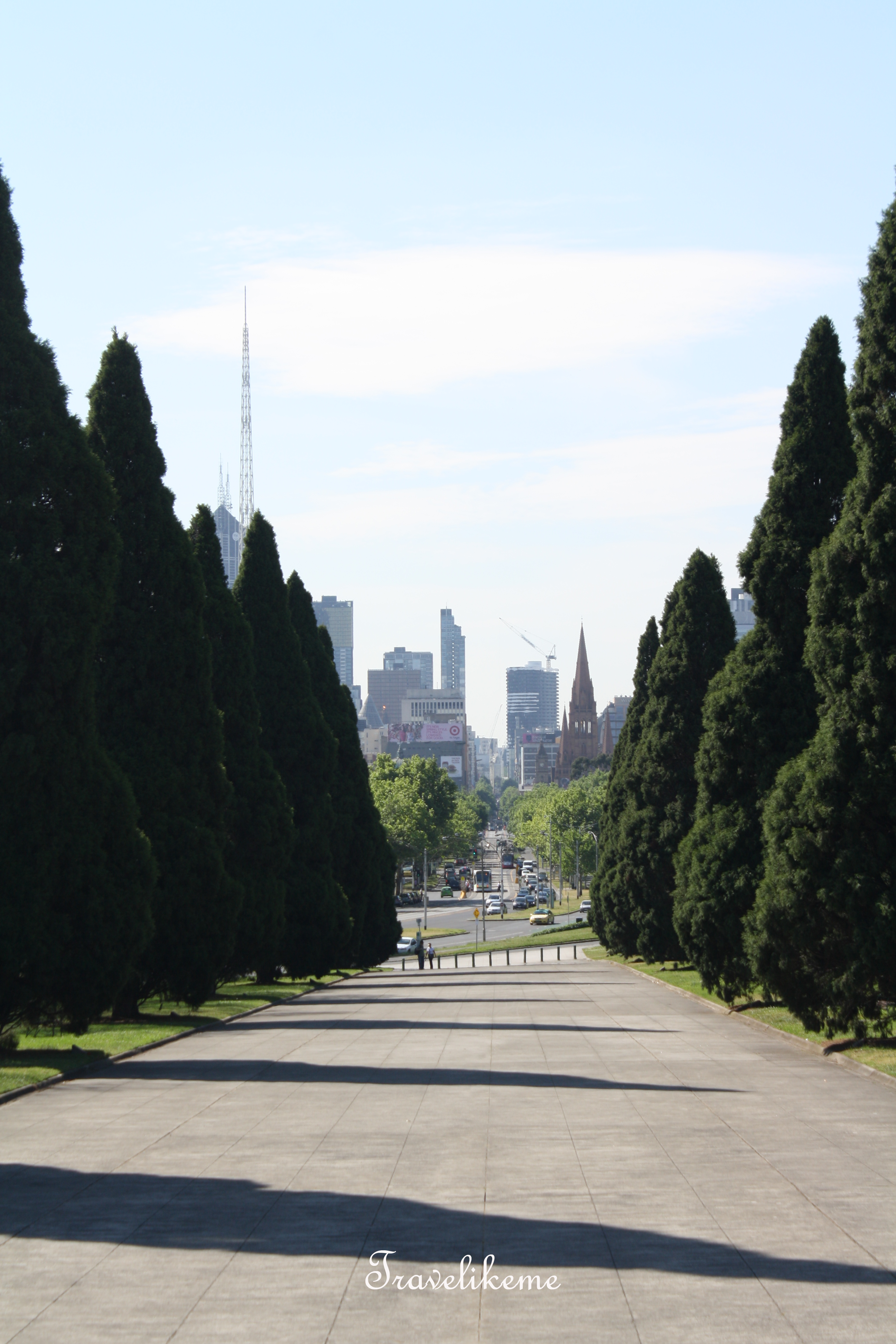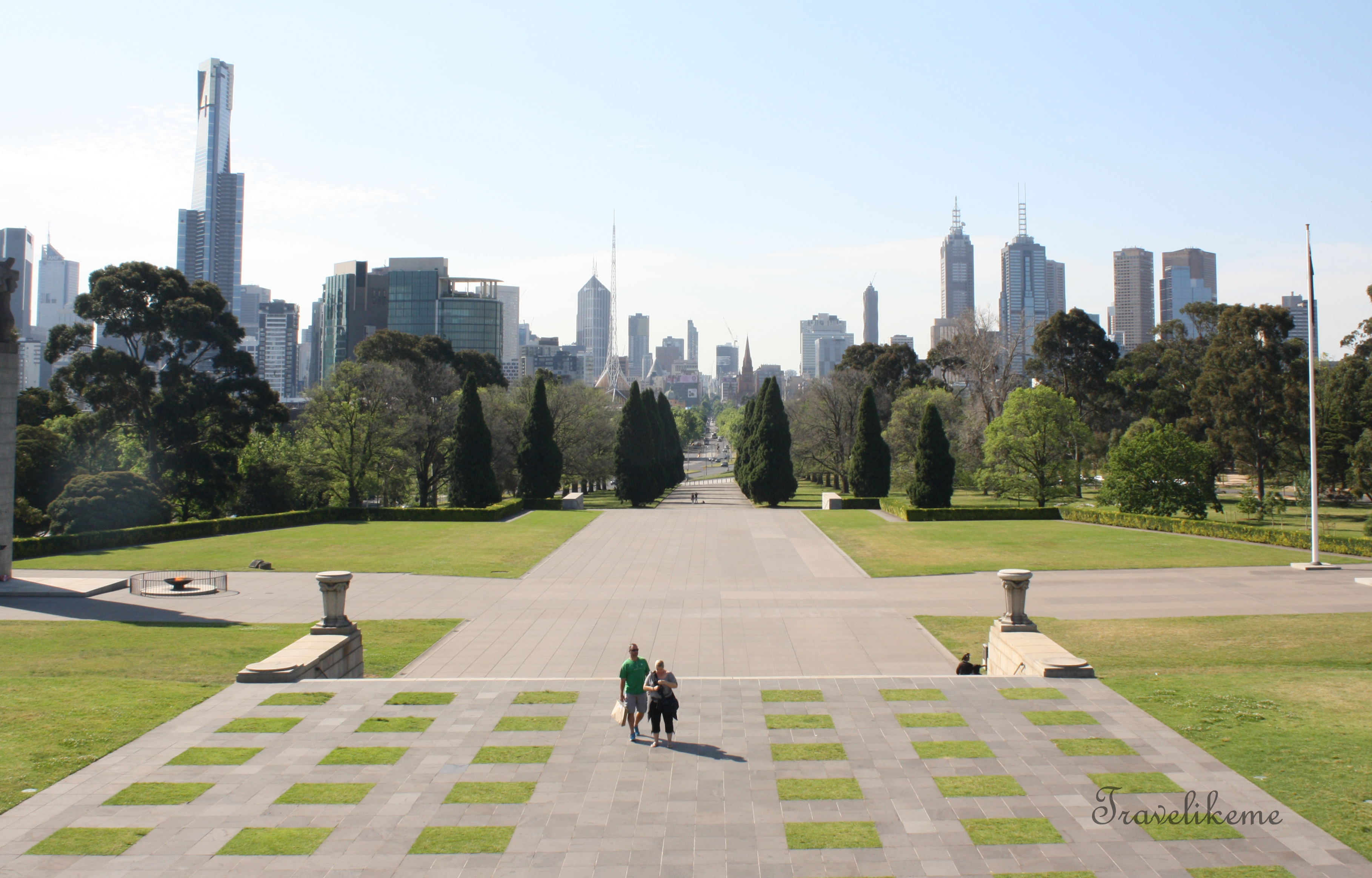 Panoramic view of the WWII Forecourt, the Ceremonial Avenue & the skyscrapers of Melbourne city from the steps of the Shrine of Remembrance