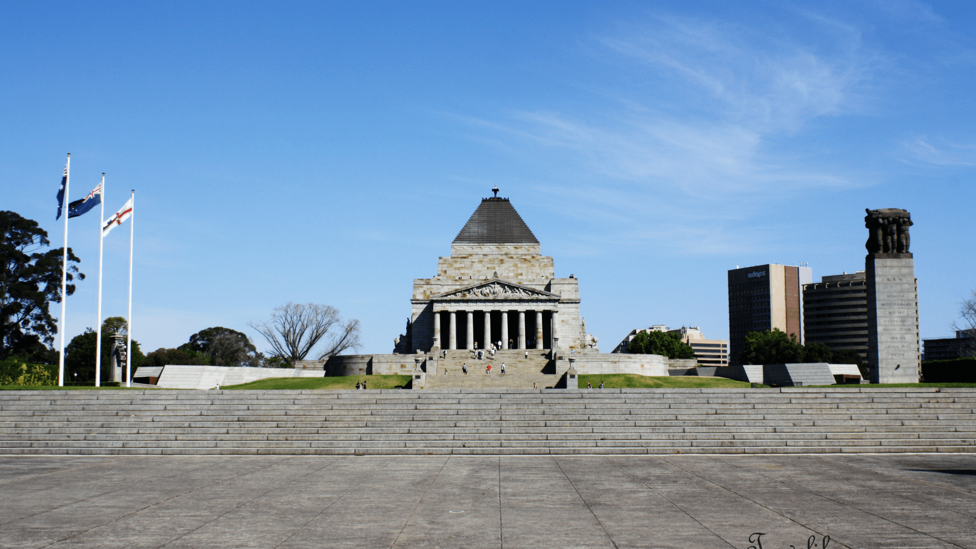 On this side of the WWII Forecourt are 3 flagpoles comprising of the Australian flag, Victorian flag & one of the flags of the 3 defence forces namely the army, navy & air force