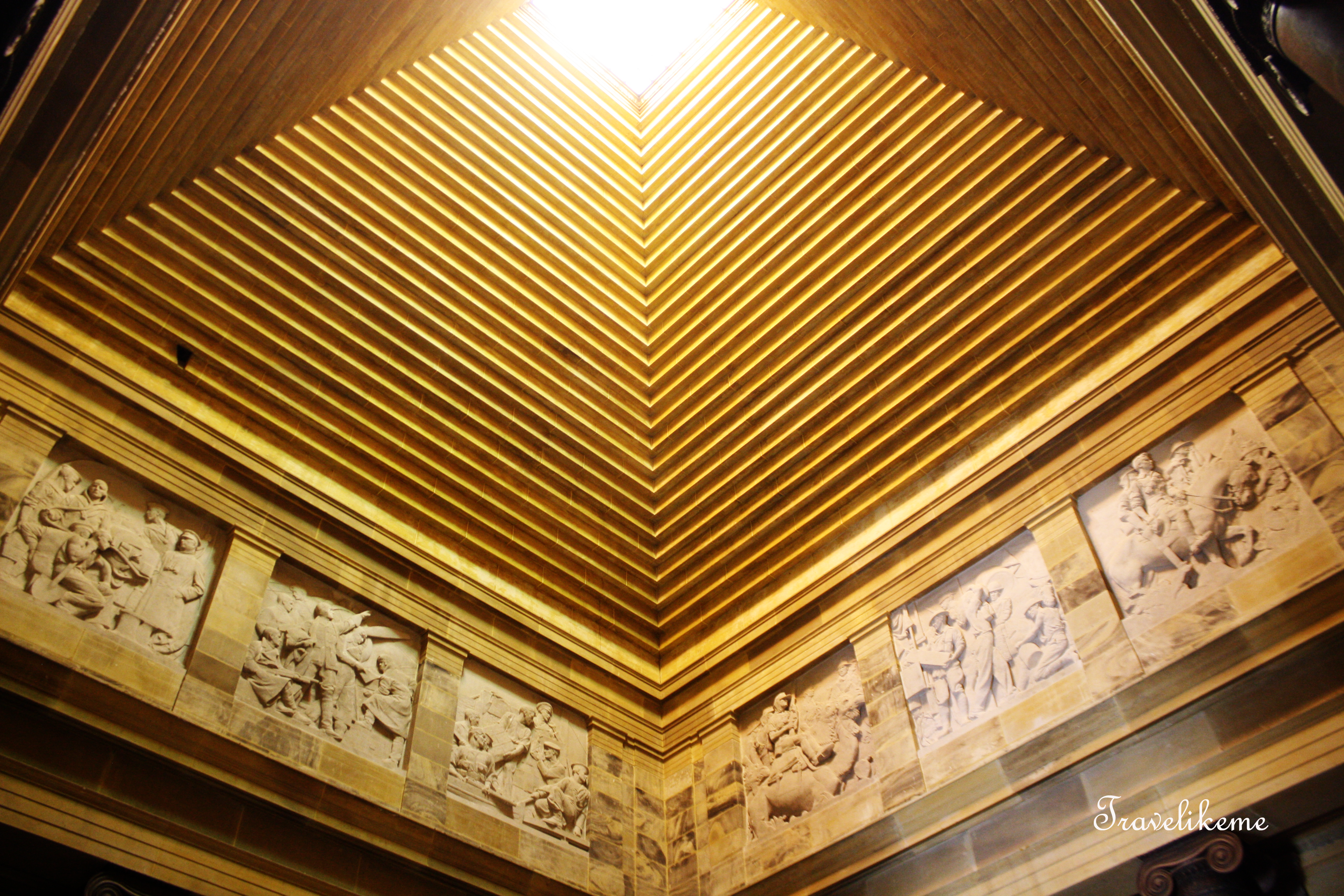 The high vaulted pyramid roof illuminates the frieze made up of 12 relief panels sculpted by Lyndon Dadswell featuring the armed services at work & during WWI
