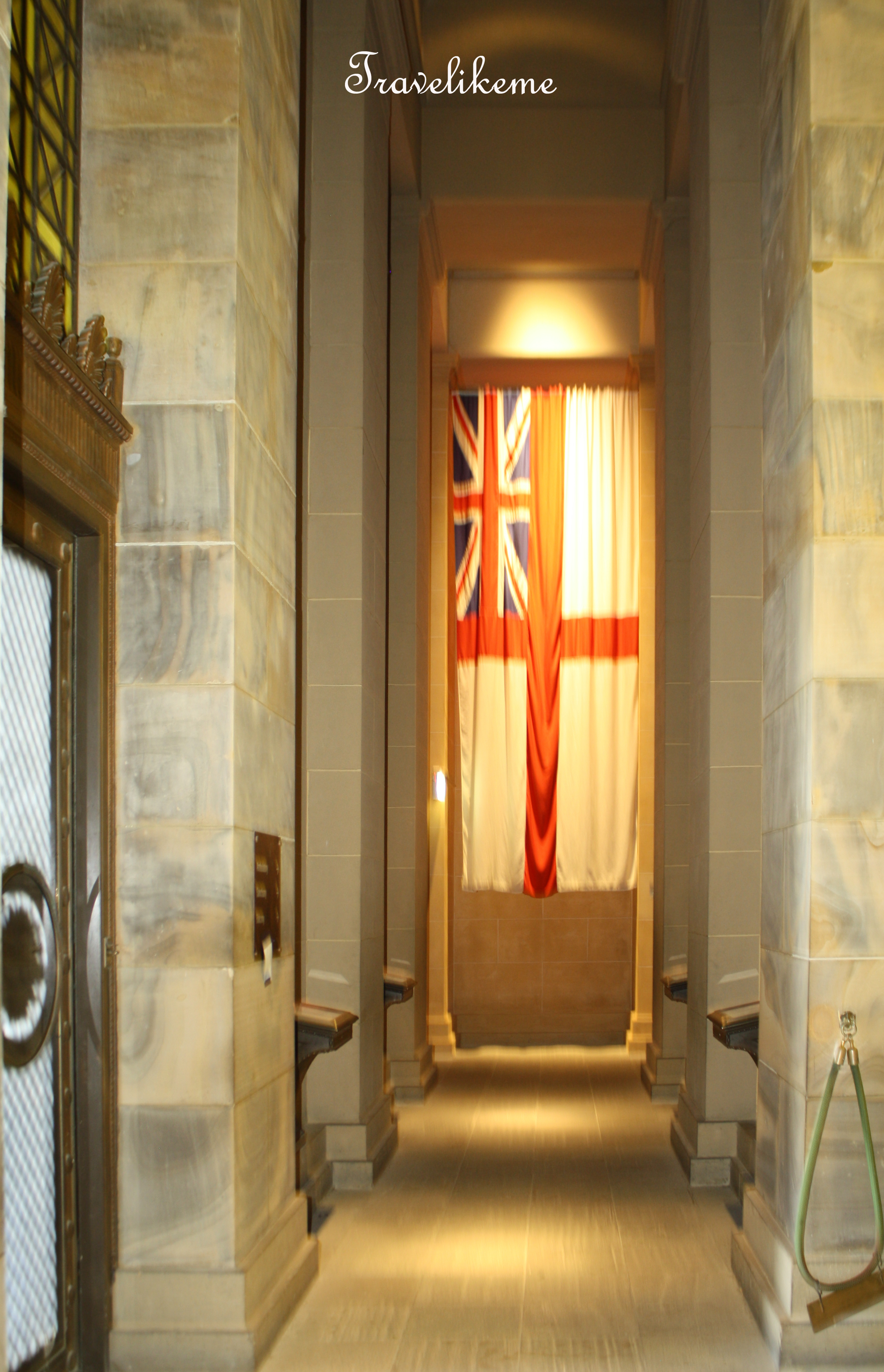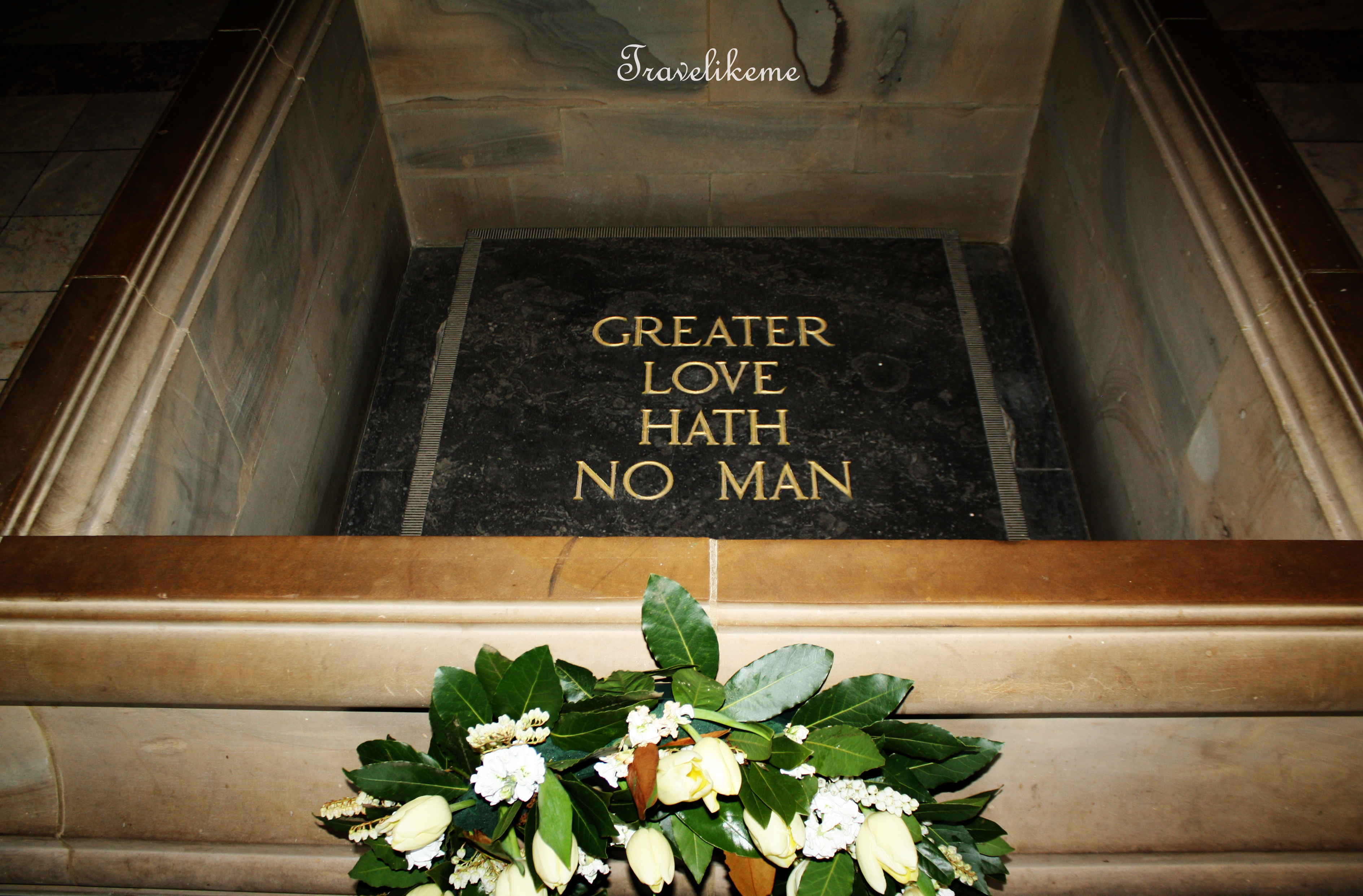 The Stone of Remembrance at the centre of the sanctuary is a marble stone sunk below the pavement so that visitors must bow their heads to read the inscription : “Greater Love Hath No Man” which is part of the Biblical verse John 15:13. On 11 November at 11am the word “love” is lit up to mark the hour & day of the Armistice which ended WWI