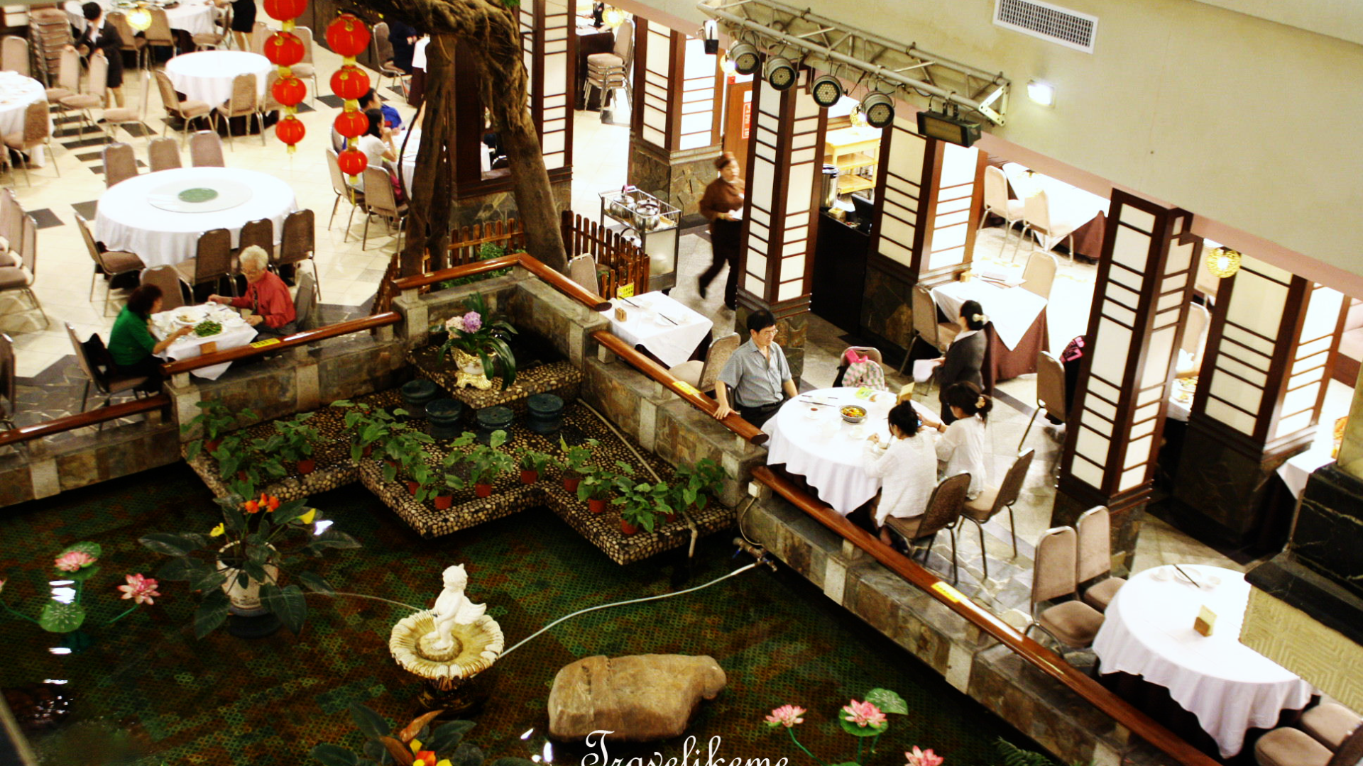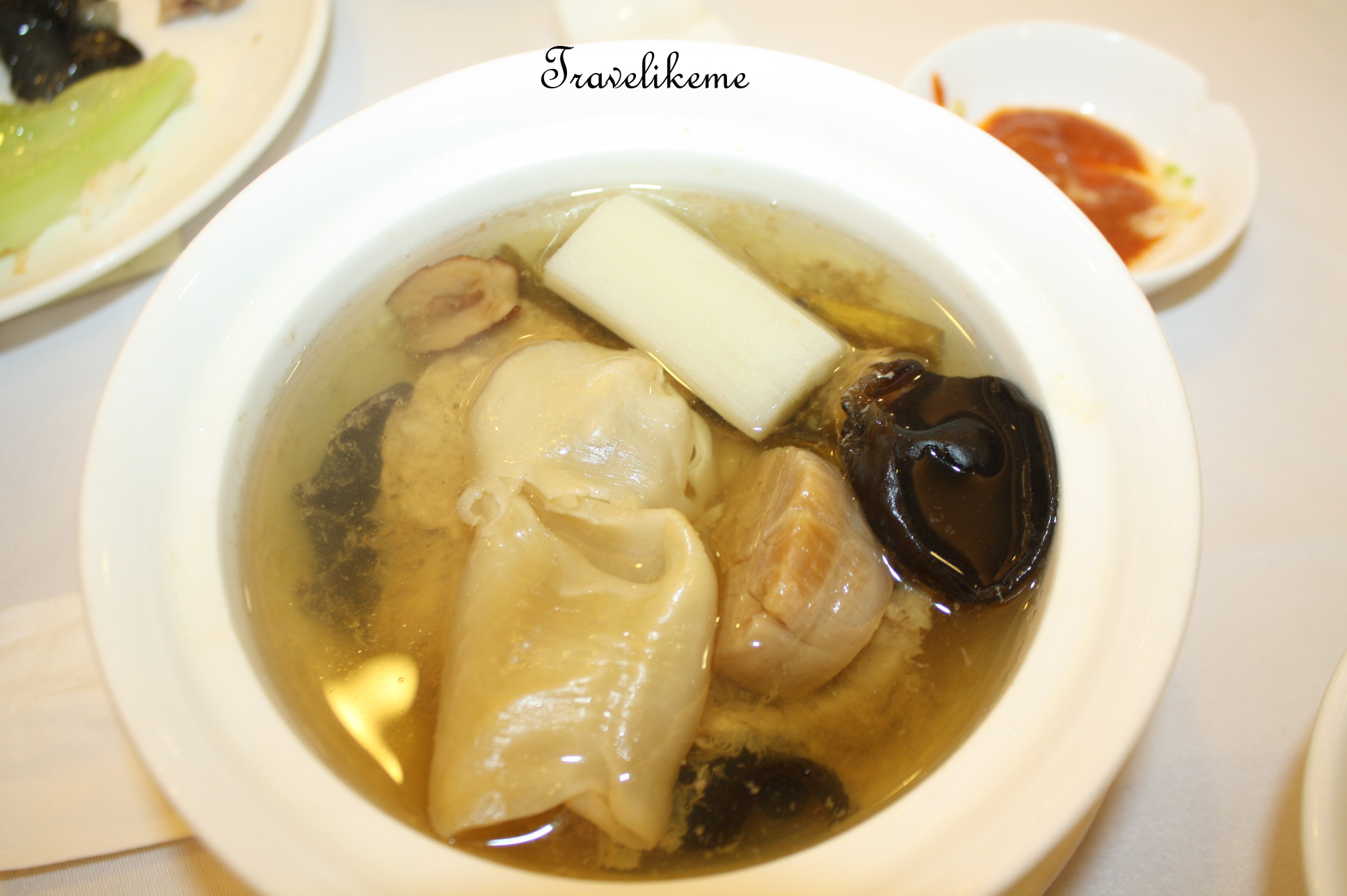 Guangzhou Restaurant at No. 2 Wenchang South Road opened since 1935, is housed in a 3 storey building.This famous Cantonese restaurant has on the ground floor central courtyard, a water pond.On the 2nd floor, there are private rooms & an open space for smaller groups to dine.Guangzhou Restaurant has a nice ambience & is spacious & not rowdy, making the dining experience pleasant.The open area for smaller groups to enjoy dining. The restaurant serves dim sum even at night though many go there early in the mornings for it’s Yum Cha!The restaurant is clean & their service relatively good on the day we visited.“Tŏng Zĭ Chi Yόu Ji” – Half a Chicken RMB¥65. This chicken comes with a rather oily & salty garlic sauce but my preference is for a grated ginger with freshly pounded chilli & garlic condiment. Like those we have with Hainanese Chicken Rice.“Hei Zong Cuì Pí Shao É” – Half a Roasted Goose RMB¥165. Black &am; White – Goose Wing verses Chicken Wing. The goose we ordered was not oozing oil like the famous one from Yung Kee Restaurant in Hongkong but I like it this way. Though both were tasty, they were not tender enough or prepared to the doneness that I would find delectable.“Lăo Tán Suan Cài Hόng Shao Ròu” – RMB¥48. This fatty pork dish with lots of Capsicum, Onion & sourish Mustard leaves was pleasing enough & the pork-lovers amongst us certainly relished it.“XO Jiàng Niàng Dòufu” RMB¥38. This Fried Doufu dish was tasty & thankfully not ‘sweet’; as I thought when I first spied the reddish coloured sauce. This goes very well with steamed white rice.“Yăng Shen Hua Jiao Tang” RMB¥98 serving for 1 person. This soup is delicious & I believe nutritious as it has Dried Scallop, Dried Octopus, Shitake mushroom, Chicken, Fish maw, Red dates & Shan Yao (Rhizoma Dioscoreae – long used as a tonic, earning the name ‘fairy food’) nicely melded together. It would have been perfect if the layer of oil was strained away.“Bái Yún Shàng Sù” RMB¥ 68. This vegetarian dish went down well with most of us. Black Fungus, Baby Pak Choy (Chinese Cabbage), White Chinese Cabbage, Carrots, King Trumpet Mushroom (Pleurotus eryngii), Straw Mushrooms & Pine Nuts. Perhaps the chef could go lighter with the use of Cornstarch as a thickener for the sauce, as it is a tad gooey.