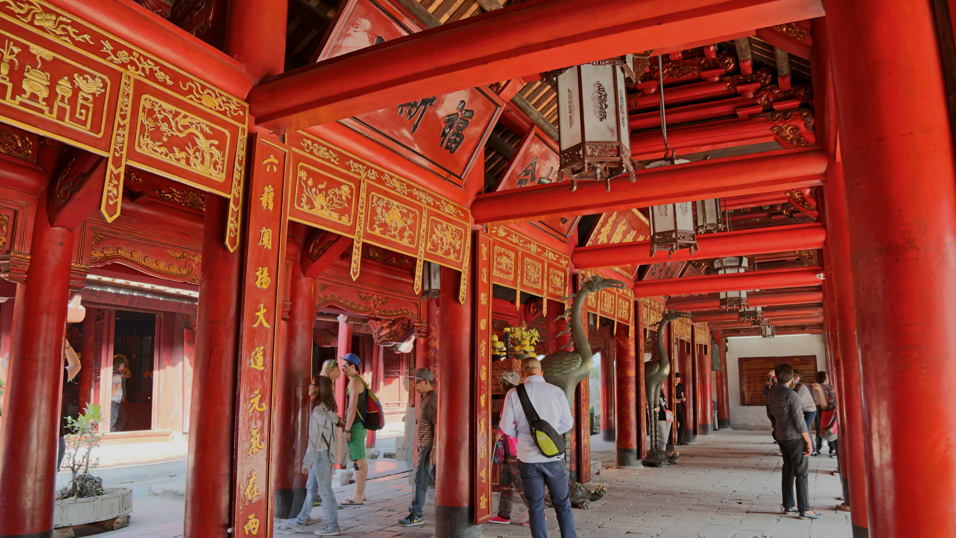 Tứ Trụ – In front of the Temple of Literature are these four tall pillars with Chinese inscriptions & two stelae from which horsemen dismounted.Standing before the Great Portico of the Temple of Literature (CồngVăn Miếu) which was built in 1070 & reconstructed during the Trần Dynasty (1225-1400) & in later dynasties but the ancient architectural styles have been carefully preserved.Vietnam’s first university, ‘Quốc Tử Giám’ the Imperial Academy was established here & built by Emperor Lý Nhân Tông especially for the bureaucrats, nobles, royalty & members of the elite as he recognised that education was of utmost importance. A bronze bell hangs above this main gate signifying that a person of importance is passing through & affiliated to the Văn Miếu.Archway meant for the Monarch is decorated with a gold gilded Dragon motif wooden panel. The Imperial Academy was later opened to the public as there was a shortage of universities in Hanoi & remained opened from 1076 to 1779.The Great Portico is flanked by two other smaller gates; the centre gate was reserved for the Monarch, the right gate for the administrative Mandarins & the left gate for the military Mandarins.. This temple complex was dedicated to Confucius, a venerated teacher, politician & philosopher & has the same structure as the Temple of Qufu in Shandong, the birthplace of Confucius in China.We passed through this gate (Cồng Đại Trung) from the First Courtyard to the Second Courtyard, approaching Khuê Văn Pavilion. The first two courtyards are quiet areas with ancient trees & trimmed lawns where the scholars could relax & get away from the busy outside world.Khuê Văn Các – The upper portion of the wooden pavilion is painted a vermillion red with two circular windows topped by an elaborate roof. A bronze bell hangs from the pavilion’s ceiling & it is rung only on auspicious occasions.We are now in the Third Courtyard after crossing the Khuê Văn Pavilion (Khuê Văn Các) which was uniquely built in 1805 on four whitewashed stone stilts. Thien Quang Well (GiếngThiên Quang) lies in the middle with the great halls (Bia Tiến Sĩ) on either side, housing treasures of the temple.Young Graduates having their portraits taken by the professional photographers.This section here is the ‘Doctors Stelae‘ which was erected in 1484 by Emperor Lê Thánh Tông. Originally there were 116 such Turtle steles but only 82 remain today. They bear the names of 1307 successful candidates of 82 triennial royal exams held between 1442 to 1779 in honour of their talent & to encourage learning. In Vietnamese culture, the turtle symbolizes longevity & wisdom.Another batch of happy graduates are having their portrait taken within the Third Courtyard with Khuê Văn Pavilion as the backdrop.I am about to cross Đại Thành Gate (CồngĐại Thành) into the Fourth Courtyard. There are several pavilions & halls within this complex, where study sessions & the strict exams of the ĐạiViệt took place.Looking through Đại Thành Gate into the Fourth Courtyard which was a flurry of activity as different groups of Graduates prepared to have their photos taken.The House of Ceremonies (Đại Bái Đường) with two dragons sitting on the ridge of the roof. According to ancient origin myth, the Vietnamese people were descended from a dragon & a fairy. So the Vietnamese believe that the dragon brings rain essential for agriculture & it also represents the emperor, prosperity & power of the nation.Love the colourful Áo Dàis & the enthusiasm of these young people, the very future of Vietnam.A Bronze pair of Crane-like mythical birds guard the altar in the middle. In Vietnamese culture, the colour red is auspicious & represents happiness, love, luck & celebration.A long corridor of vermillion pillars with gold embellishments & wooden plagues with Chinese proses in gold lettering. Gold is associated with wealth, prosperity, royalty, happiness & change.An ornamental incense holder with two twining Dragons, in front of the Thượng Điện for devotees to place the lighted joss sticks in worship of Confucius (551-479B.C.) & his disciples.Within the Thượng Điện Confucius & four of his closest disciples Yanhui, Zengshen, Zisi & Mencius are worshipped.Beautiful traditional wooden doors within the Thượng Điện.Thái Học Gate (Cồng Thái Học) brings us to the Fifth & final Courtyard – the Thái Học Courtyard.The Thái Học Courtyard was constructed in 2000 where the Quốc Tử Giám or Imperial Academy formerly stood. This section was destroyed in 1946 during the French occupation & was re-built to honour talent, the national traditions of culture & education in Vietnam. It consists of a front building, rear building, left & right buildings, a bell tower & a drum tower on each side & some other peripheral buildings. This front building is where ceremonies in memory of cultural scholars, scientific & cultural activities are held.An Orchestra performs at regular intervals featuring some bamboo instruments, playing traditional music in honour of the Royal founders & Confucius.Entrance to the rear building at the Thái Học Courtyard with the Altar to Chu Văn An, rector of the Imperial Academy, facing the main doorway.Altar of Chu Văn An, a venerated rector of the Imperial Academy.Overview of the first level of the rear building at Thái Học Courtyard.This upper level of the rear building is dedicated to the three monarchs who contributed most to the foundation of the temple & the academy. Right in the middle is Lý Nhân Tông (1066-1127) who founded the Imperial Academy & Lê Thánh Tông (1442-1497) who had the Doctors Stelae erected & Lý Thánh Tông (1023-1072) not in the picture, who founded the temple in 1070.On the second level overlooking the tiled roof of the rear building & the Bell Tower.Lầu Chuông – This Bell was cast in 2000 & has a height of 2.1m & width of 0.99mView of t