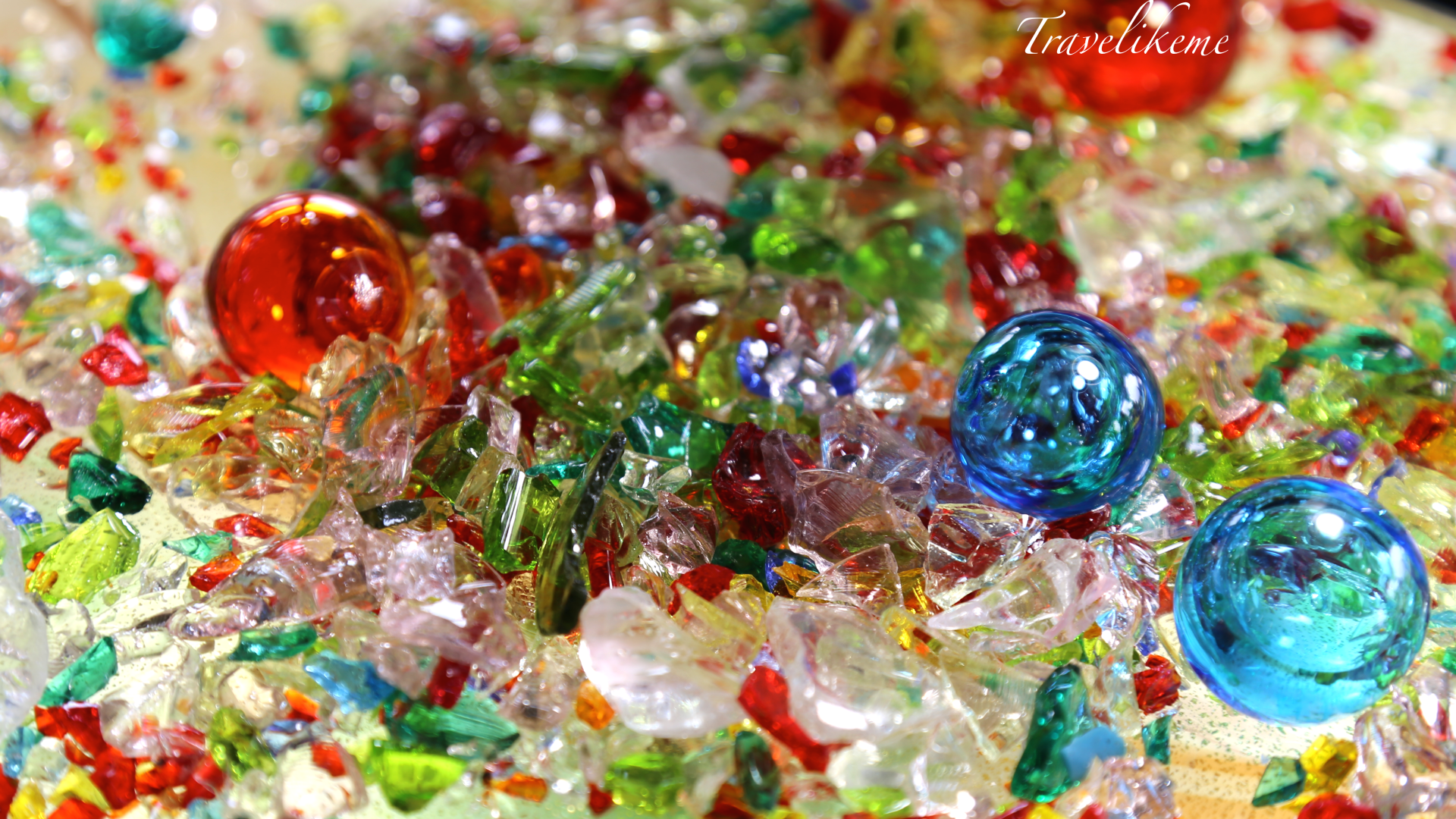 A kaleidoscope of colourful glass bits & baubles at the Glass-blowing pavilion at Okinawa World.A cute piece of art depicting the teeny-weeny Garden eels (Heterocongrinae) part of the Conger eel family which can be seen live at Churaimi Aquarium, Motobu Beach Okinawa, Japan