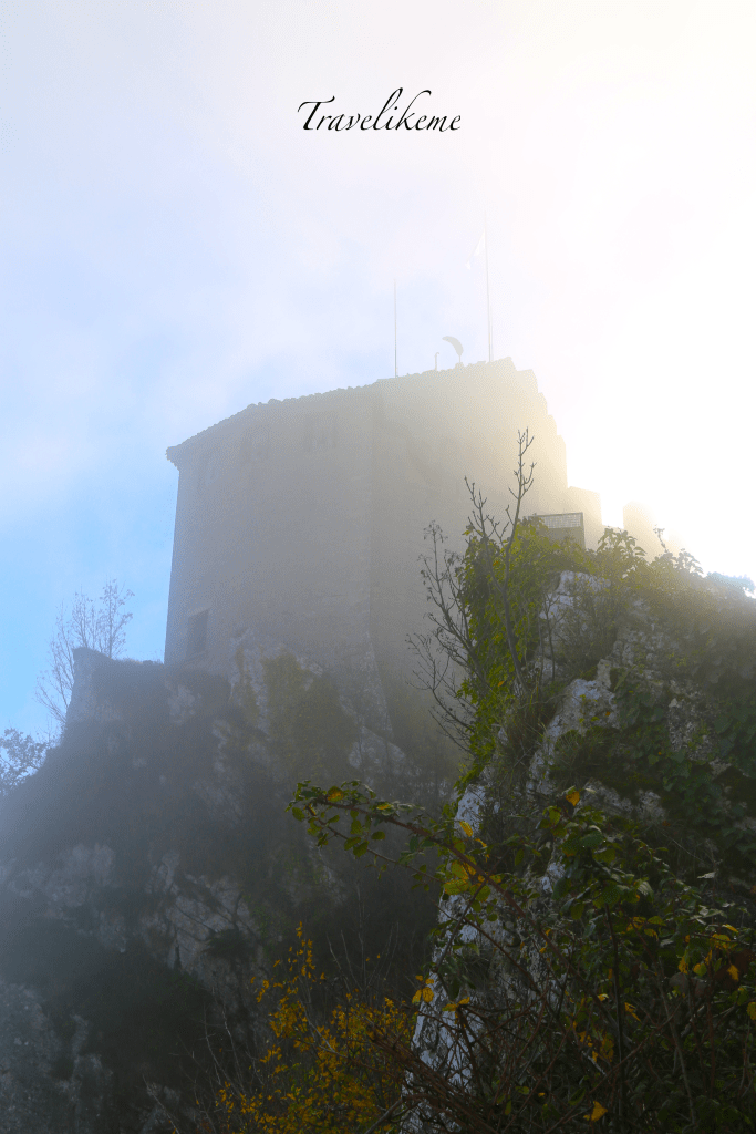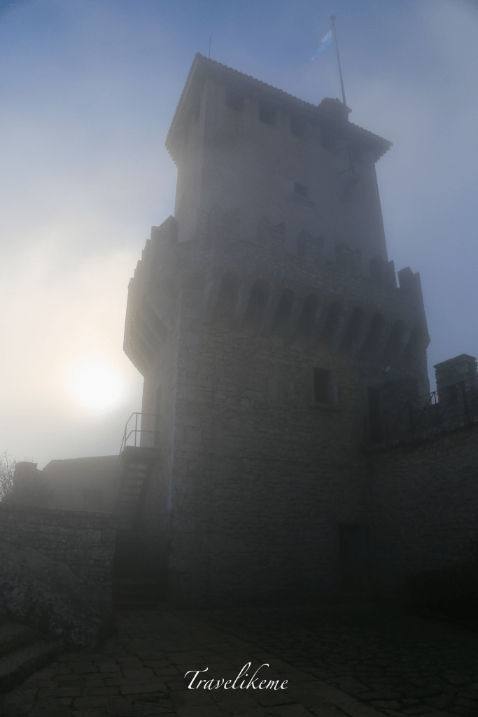 A misty morning beckoned & Guaita Tower is shrouded in a coat of white with the flag of the Republic of San Marino flying high.