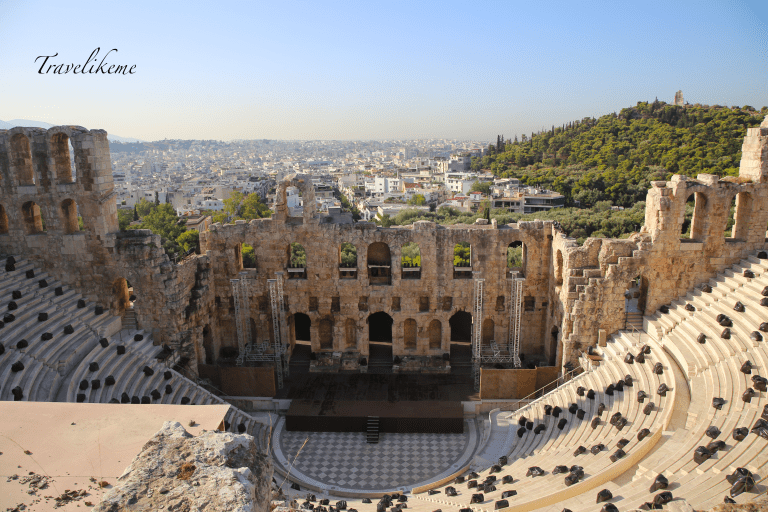 This is the partially reconstructed Odeon of Herodes Atticus which is a stone theatre located on the Southwestern slope of the Acropolis. It was built in 161 AD by a Roman citizen Herodes Atticus in memory of his wife, Aspasia Annia Regilla to be used as a venue for music concerts with a seating capacity for 5000. It was destroyed & left in ruins by the Heruli in 267 AD until the 1950s, when the audience stand & the orchestra stage was restored using Pentelic marble from Mount Pentelicus situated Northeast of Athens, an ancient quarry protected by law & used exclusively for the Acropolis Restoration Project. Some artistes who have staged shows here include Maria Callas, Frank Sinatra, Nana Mouskouri, Luciano Pavarotti, Jose Carreras, Placido Domingo, Vangelis Mythodea, Yanni, Sting, Mario Frangoulis, Elton John Andrea Boccelli, Foo Fighters etc.