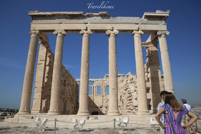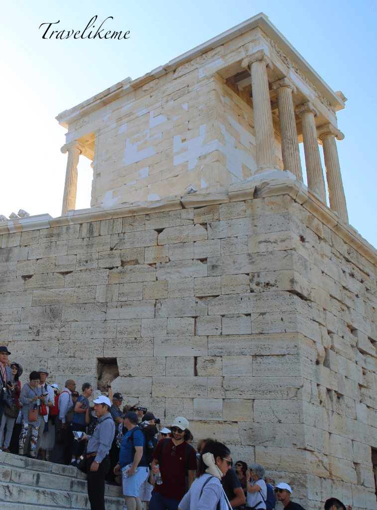 The Temple of Athena Nike was built around 420 BC & is the earliest Ionic temple on the Acropolis. It sits on a steep bastion on the southwest corner of the Acropolis on the right side of the entrance, the Propylaea. Of Ionic Order it has 4 monolithic columns at the east & west fronts. As the epithet Nike (Victory) implies, here Athena was worshipped as the Goddess who stands by the Athenians in time of war.