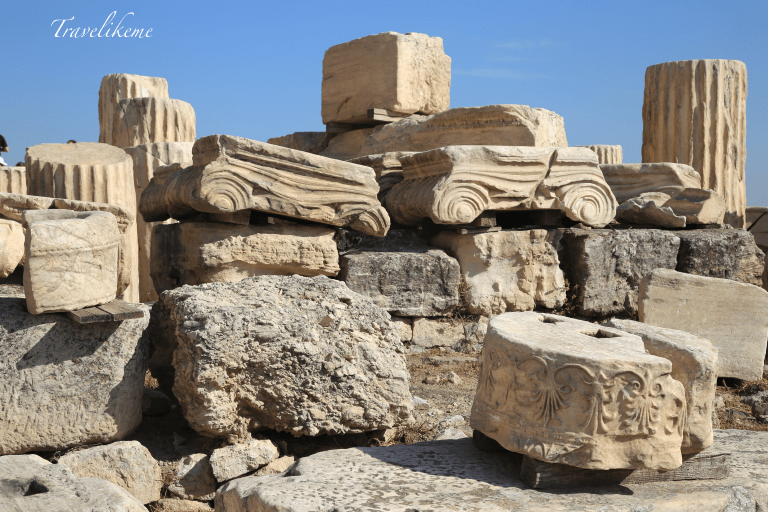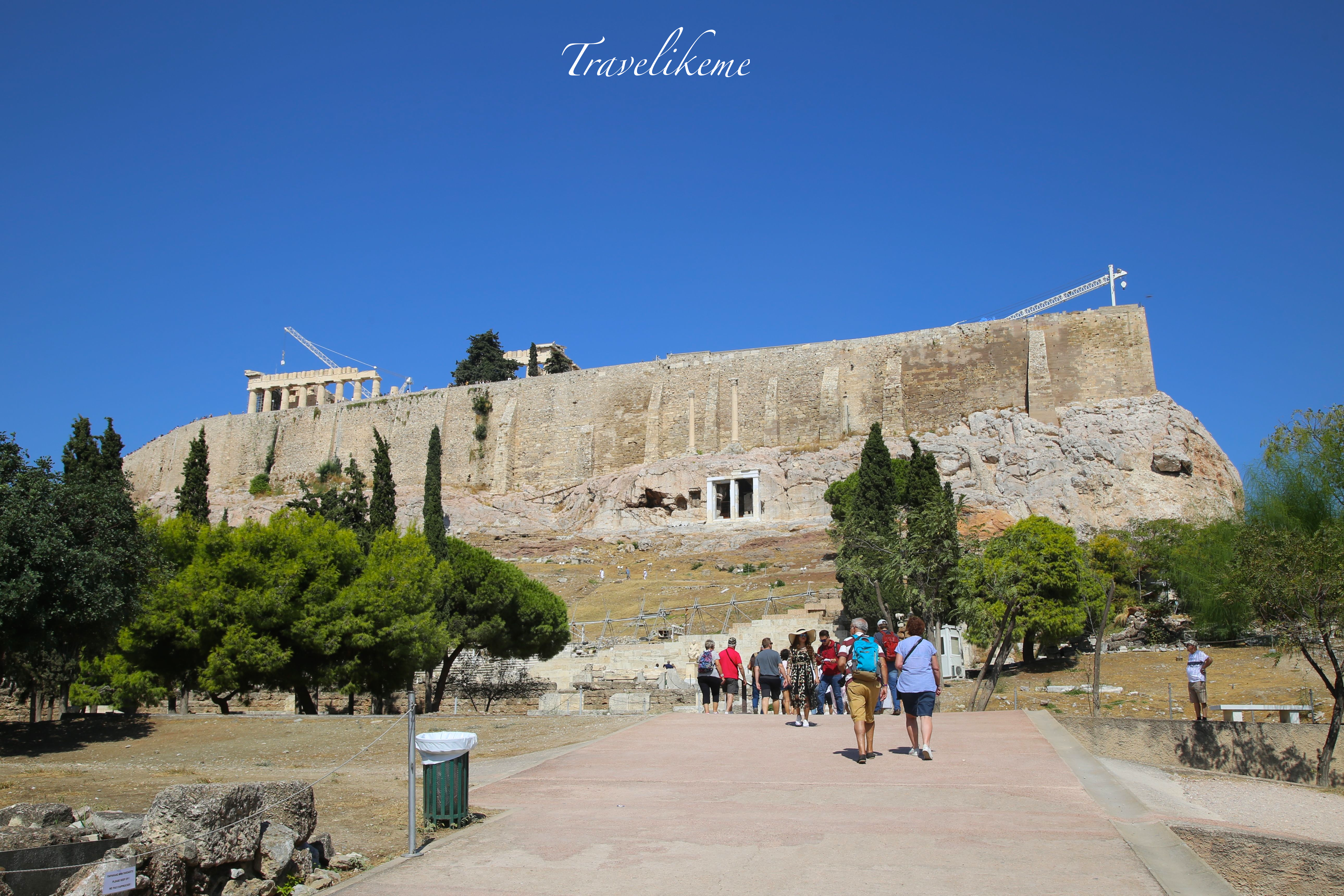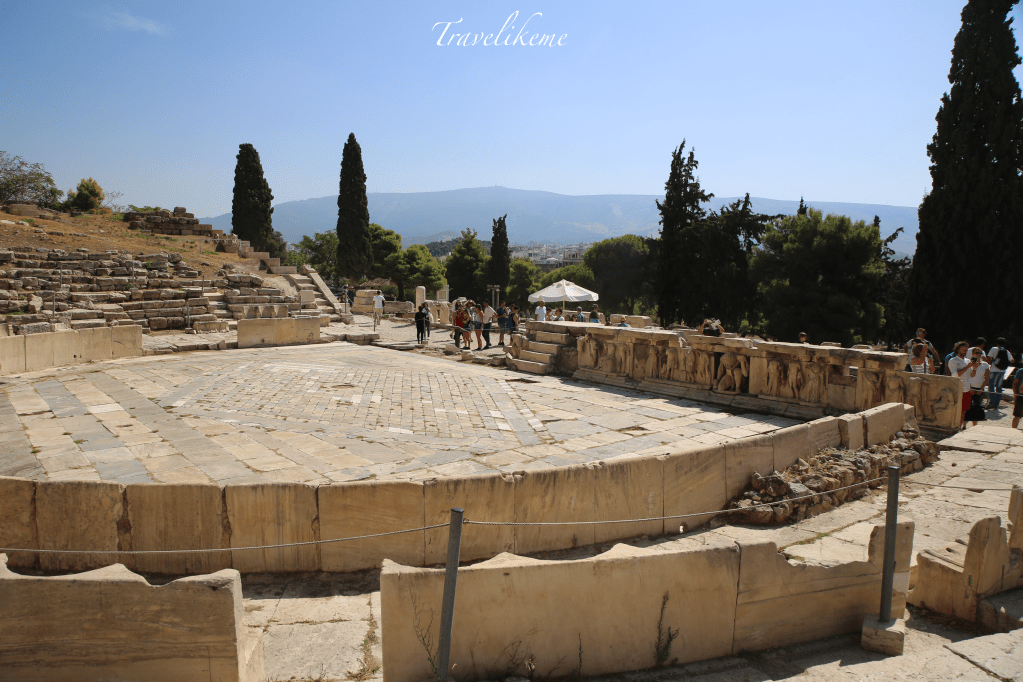 The Choragic Monument of Thrasyllos was constructed on the flattened surface of the Acropolis rock in the most prominent place covering the entrance of a cave. On top of the monument stood the bronze tripod which Thrasyllos won. 50 year later his son, Thrasycles won 2 more contests & added on to his father’s monument 2 more tripods with a statue of Dionysus in the middle. The monument & cave was converted into a church named “Our Lady in the Cave” during the Byzantine era & was dedicated to the Mother of God. It stood in perfect condition for over 2000 years until it was bombed & destroyed by the Ottomans in 1827. We see here the restored monument with only 2 columns instead of 3, recently completed in 2017.View from the stands of the Theatre of Dionysus& remains of the Roman stage building with re-used Bas-reliefs depicting scenes from the myths of the god, Dionysus.This is the pathway that leads to the exit at the South-eastern part of the Acropolis going towards Acropolis Museum. It is very obvious from this viewpoint that the Acropolis is sloping upwards from the Western to Eastern section giving every visitor a good workout.