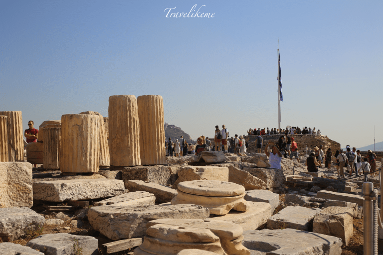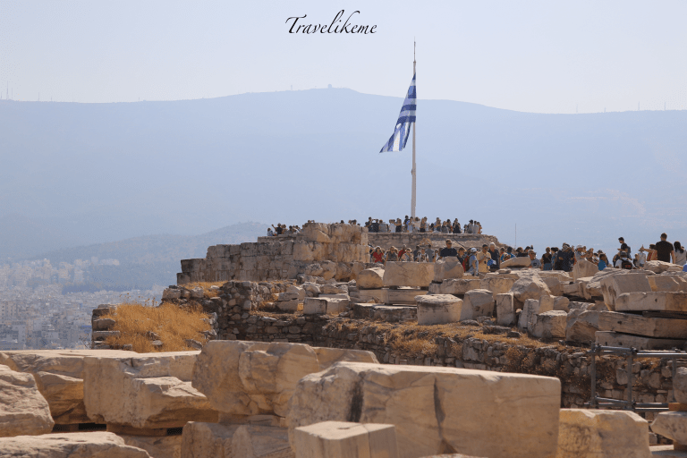 On this Eastern end of the Acropolis is a high Flag pole flying the Greek National flag. During WWII when the Germans occupied Athens, they ordered the Evzone guarding the flag to take it down. Konstantinos Koukidis calmly did so, wrapped himself in it & jumped to his death at the Acropolis.