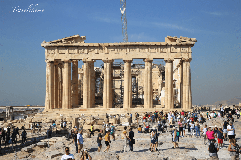 Notice the sculptures on a remaining section of the East pediment of the Parthenon & the Doric Order architecture most easily recognised by the simple circular capitals at the top of the columns. Since 1975 till date, large scale restoration projects have been undertaken to restore & reverse the centuries of attrition, pollution, decay, destruction from military use & misguided past restorations.
