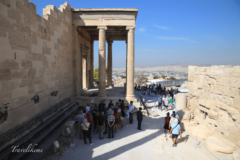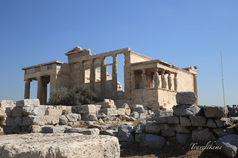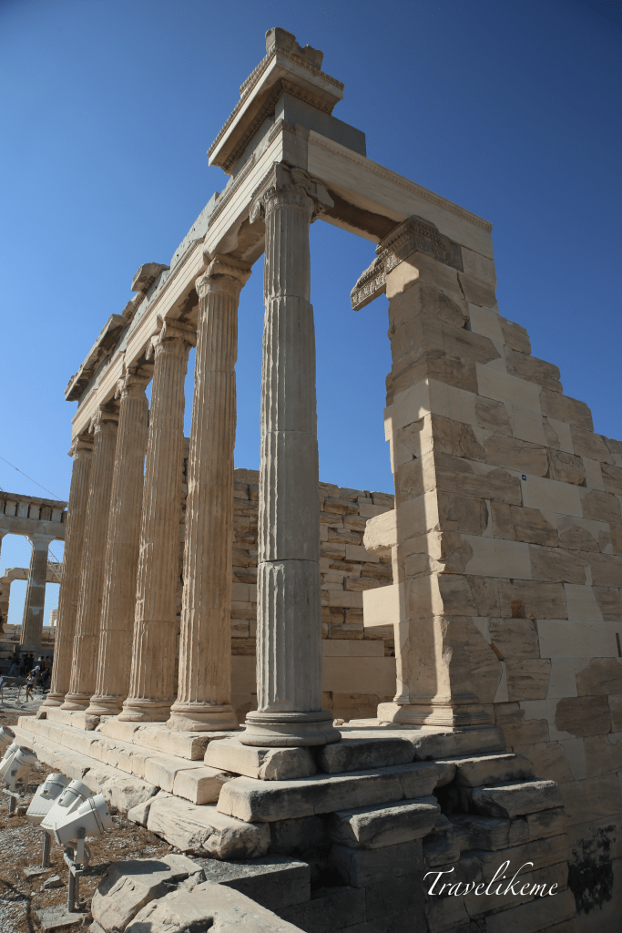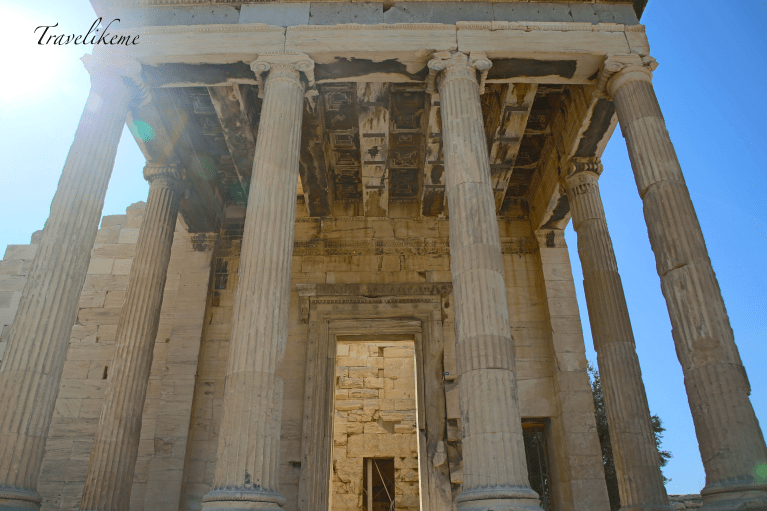 This is the North-eastern view of the Erechtheion where you have to descend a flight of stairs to see the North Porch. The Erechtheion was associated with ancient holy relics like the Palladion, a carved wooden effigy of Athena Polias (Protectress of the City); Poseidon’s Trident & the Saltwater Well called Erechtheis that resulted from Poseidon’s strike; the sacred olive tree planted by Athena after her victory over Poseidon (the existing one seen today is however planted later by Sophia of Prussia); the supposed burial places of the mythical kings Kekrops & Erechtheus; the sacred precinct to Kekrop’s daughter Pandrosus & an altar to the tribal hero Boutes.