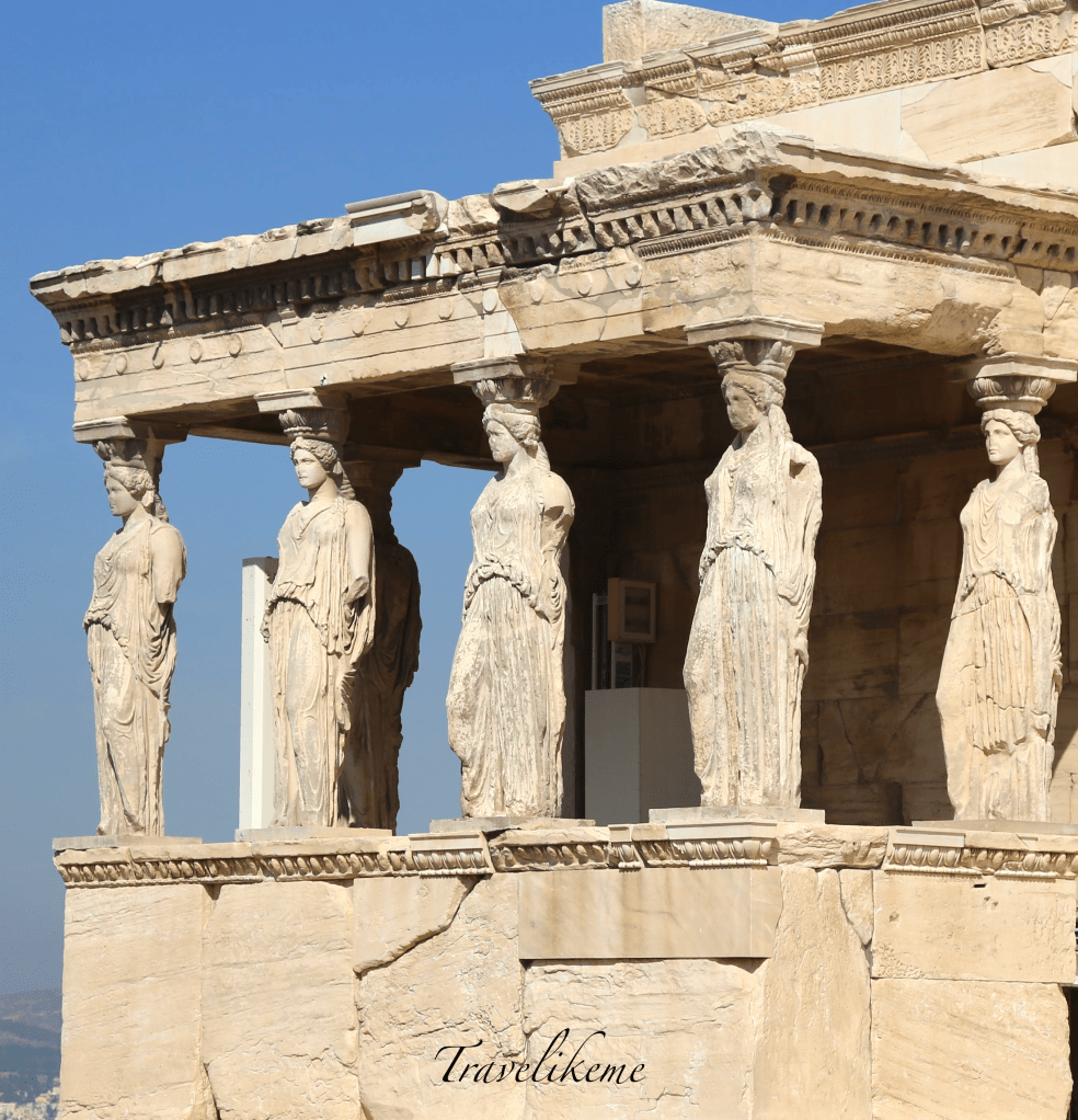 The Porch of the Maidens is famous & easily recognisable by the 6 draped female figures or Caryatids which are stylised pillars used to conceal the gigantic 15 ft beam needed to support the Southwest corner over the Kekropion, after the building was drastically reduced in size due to a budget cut at the onset of the Peloponnesian War (431 – 404 BC).