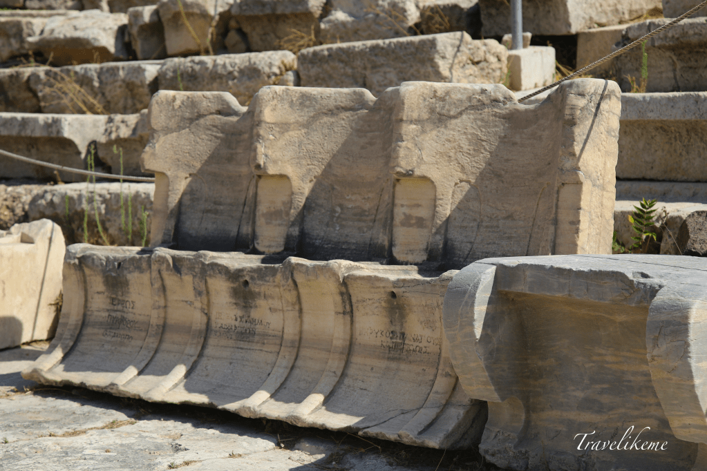 The Theatre of Dionysus in this present state, dates from around 390 -325 BC. Alterations during the Hellenistic period saw the addition of 67 Marble thrones around the periphery of the orchestra, inscribed with the names of the dignitaries that occupied them. These Klismos chairs are thought to be Roman copies of earlier version & at the centre of this row of seats was a grand marble throne reserved for the priest of Dionysus.