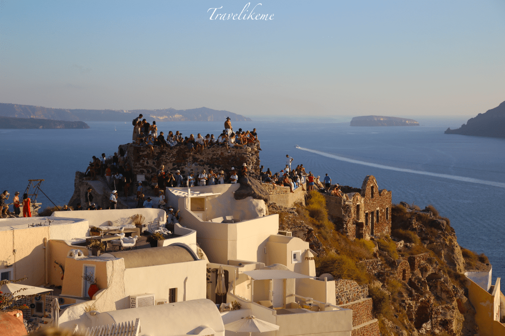 Enthusiastic sunset watchers clamour & climb over steps & barriers to find the perfect spot, which is at the pinnacle point of Oia where the castle ruins overlook the caldera.