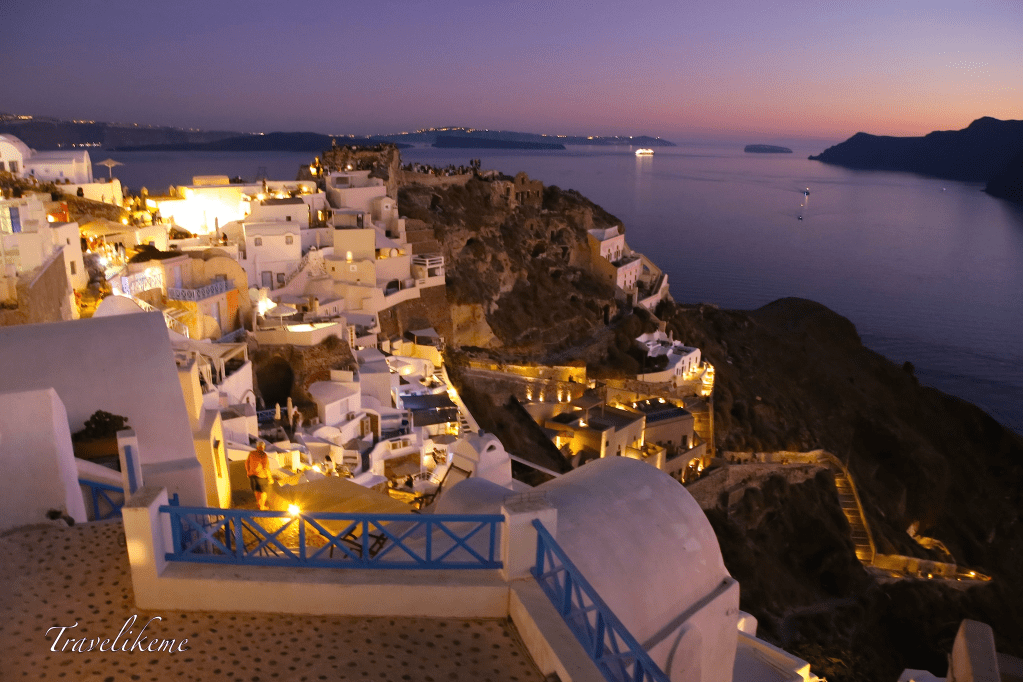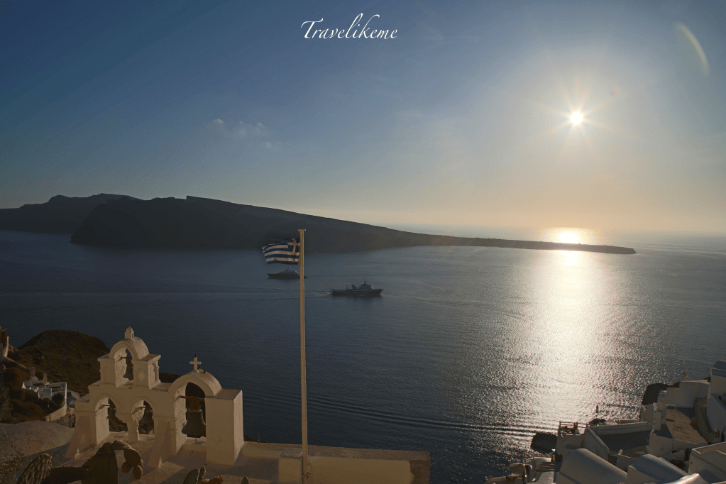 This sunken caldera or collapsed volcano crater resembles a circular lagoon with a maximum depth of 400 m. On top of the surrounding gigantic cliffs are beautiful villages painted in white lime water so that runoff rainwater can be collected other than for aesthetics. Another possible reason was that during the Ottoman rule which lasted over 400 years, Greeks were not allowed to fly their National flag. In defiance, Oia painted their houses white & the domes blue to show where their true allegiance lied.