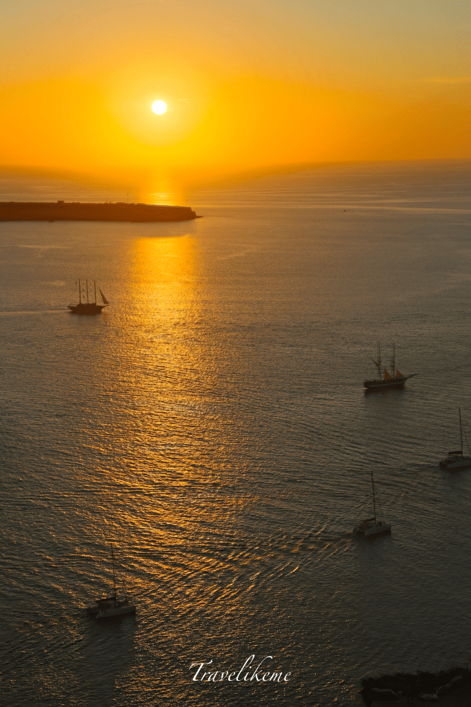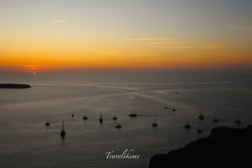 The sea is relatively calm at this time in the western part of Santorini & the Sunset cruises are all converging at Amoudi Bay just below Oia to give their guests the best sunset viewing experience possible.