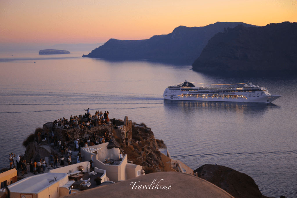 An ocean liner cruises by observed by a crowd already gathered at the castle ruins awaiting the most spectacular show on earth. Behind the liner is the island of Thirasia & the uninhabited tinier one, Aspronisi also known as ‘White Isle’ because it is covered by dense layers of pumice & tephra ejected by the volcano. It is also a nesting ground for some species of migratory birds.
