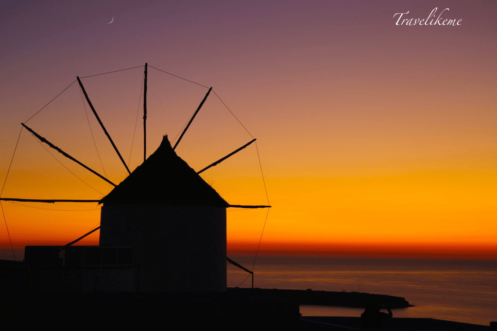 The blue sky by now transforms into a canvass of gradient shades of pink, purple, yellow, orange & blood red. This is my favourite photo of that glorious moment, with the crescent making a shy appearance just above the windmill.