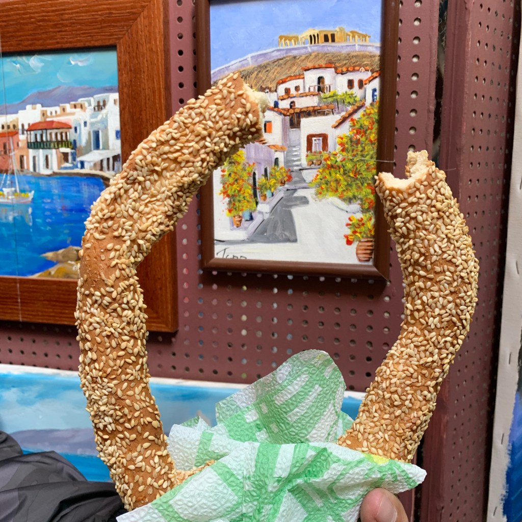 All these beautiful & sccullent local produce like pears, peaches, apricots, nectarines, grapes, bananas, figs & promegrantes are beckoning us & to take a bite! The Monastiraki Flea Market at Ifestou begins properly here, right between the 360 Degrees Hotel building & Monastiraki Metro station.Souvenirs that you can take home as reminders of your wonderful time spent in Athens & the sun-kissed Greek islands scattered mostly in the Aegean Sea.I am holding here a large piece of Koulouria which I have turned into a horseshoe. You have got to try this traditional Greek bread ring which is sesame crusted, crunchy on the outside & soft & chewy on the inside. The Greeks have this for breakfast & you can eat it with spreads like butter, honey or jam; or if you prefer it savoury… Feta, Graviera cheese & Kalamata olives! You can’t go wrong with this ubiquitous snack that is freshly baked, absolutely delicious & sold by pushcart vendors.
