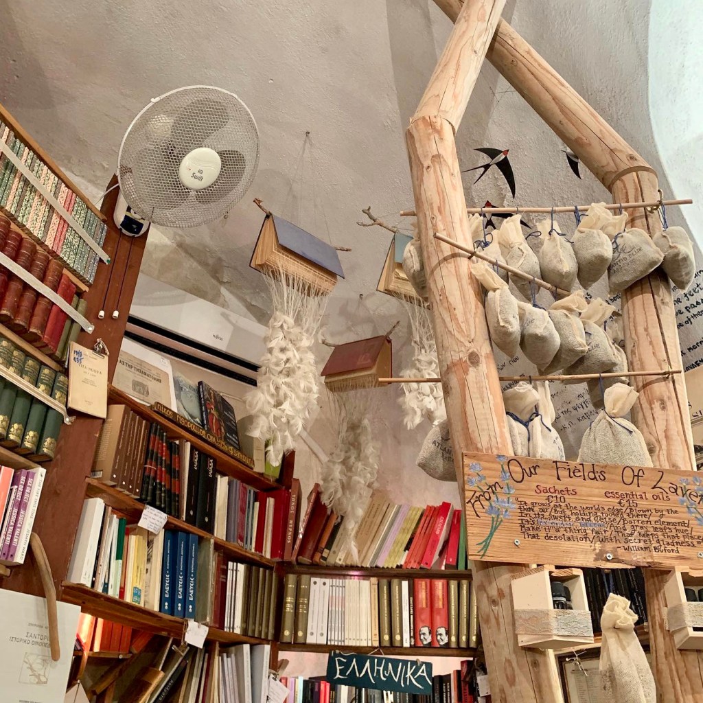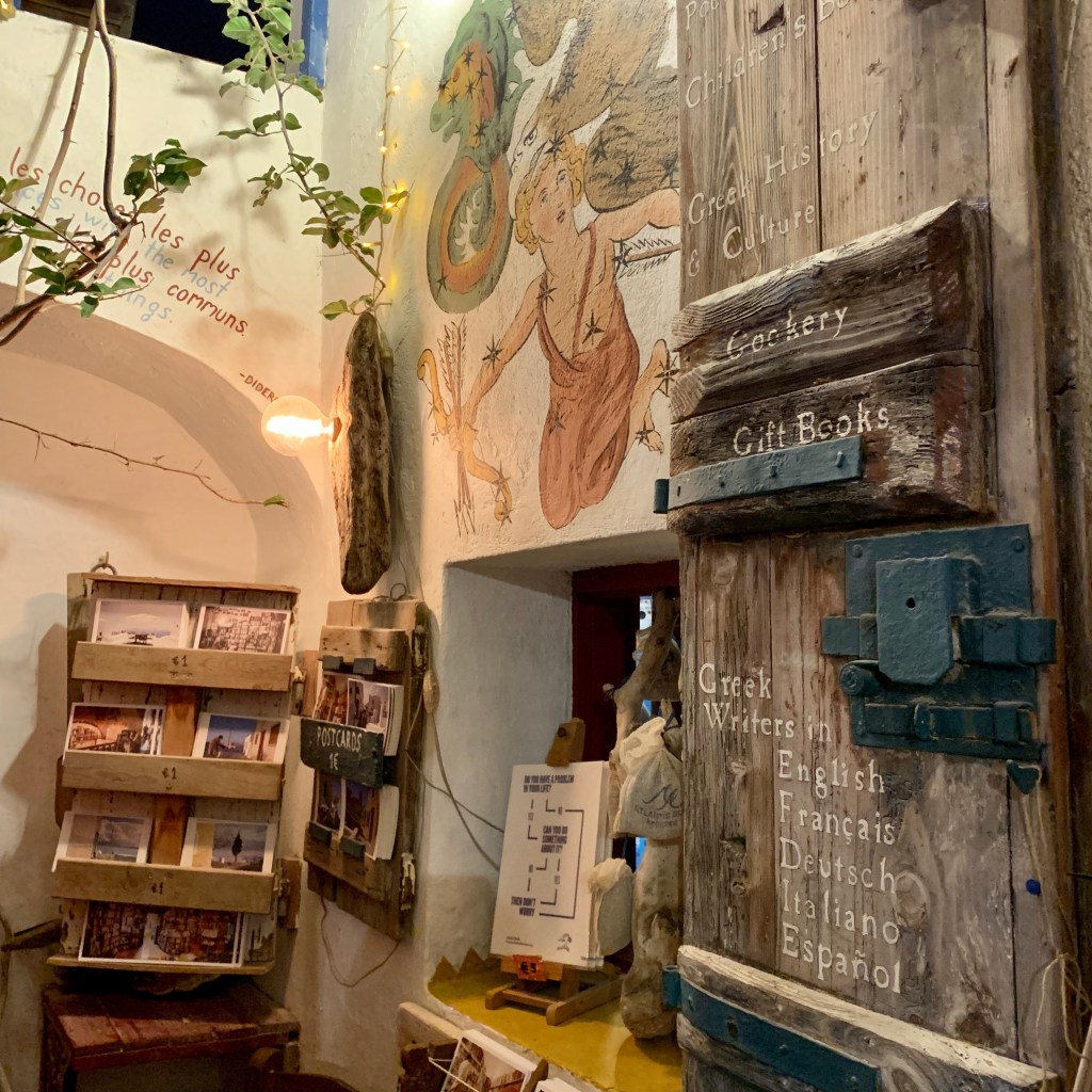 This quaint, little bookshop located on the main thoroughfare of Oia in Santorini has gained so much popularity in recent years that tourists have included it in their must do list.This is the only bookshop in Oia & it is special just because it is housed in a Cycladic cave house that hangs on the cliffs of the caldera overlooking the Aegean Sea.Atlantis Books was first conceptualised in 2002 when two friends Craig & Oliver from Oxford University were holidaying in Santorini & ran out of books to read.In 2004, they returned & set up the hypothetical bookshop with the help of friends from Cyprus, England & the United States.The shelves are really chock a block full of literary masterpieces.There is literature in English, French, Italian, Spanish, German, Chinese & Greek. They also carry new & used books of modern classic fiction & non-fiction with a decent selection of peotry, philosophy, art & all things of Greek interest.Atlantis Book is unusual in many ways from the homey feel to the interesting display of books & decor. There is actually a bunker at the back of the house & someone actually lives there. This little space is also shared by a dog & a cat adding to the ambience.In 2016, Atlantis Books made it to National Geographic’s edition of “Destinations of a Lifetime.” Craig Walzer, one of the original founders of this iconic bookstore is amused by the accolades & isn’t complaining about the good fortune & publicity.Notice the scribbles on the roof, that document the time line of the store’s history, its development from start-up to the crisis in 2011 when the bookshop almost folded.The upper roof of the bookshop is a lovely place to hangout & soak up some sun & have a good read on hand.Atlantis Books has a breathtaking view but more than that, this place is a delight for voracious readers who can meet other book lovers & engage in meaningful conversations.