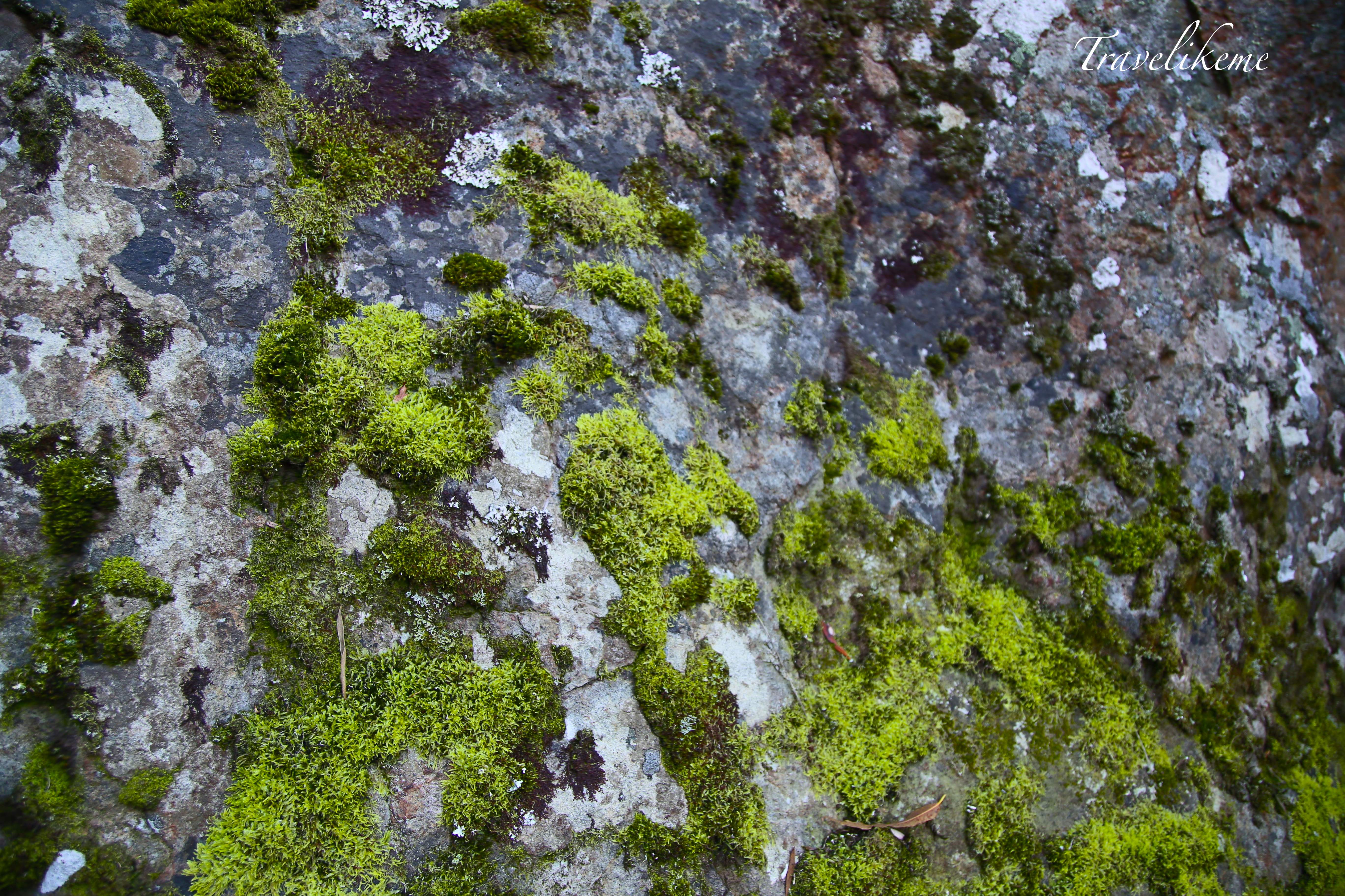 Vibrant green mosses and lichen flourish in this damp shady rock surface painting a verdant tapestry.