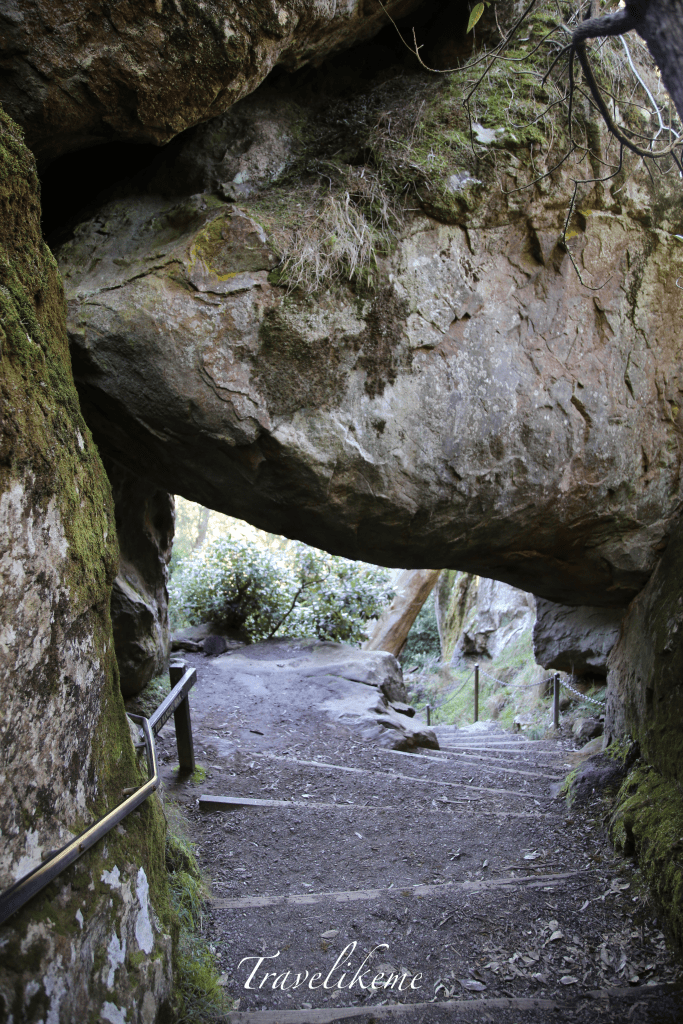 Going under the “Hanging Rock” which is wedged in between other boulders; balanced quite precariously!