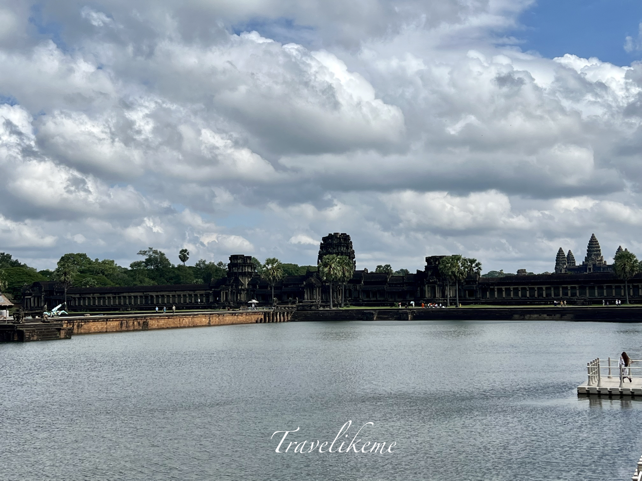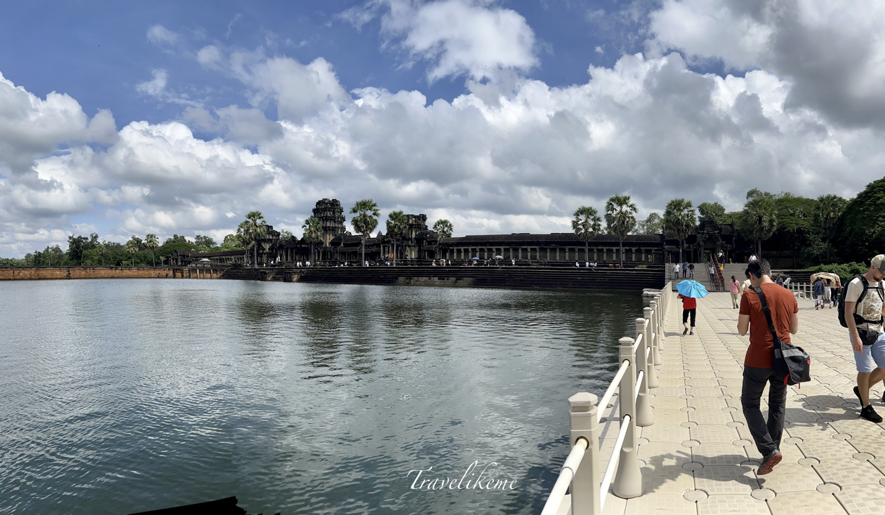 This sandstone causeway in the west is the Main entrance to Angkor Wat. A moat 190m wide & over 5 km in perimeter surrounds the temple complex. This is the panoramic view of the West wall of the outer enclosure of Angkor Wat.