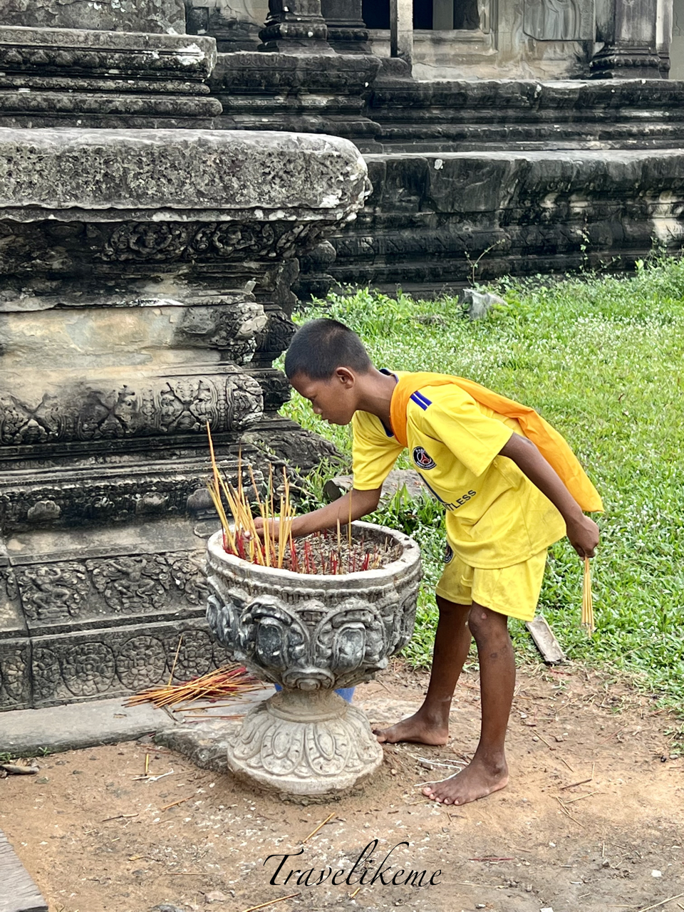 Chanced upon a group of monks who were also visiting Angkor Wat placing joss sticks in the incense burner after prayer.