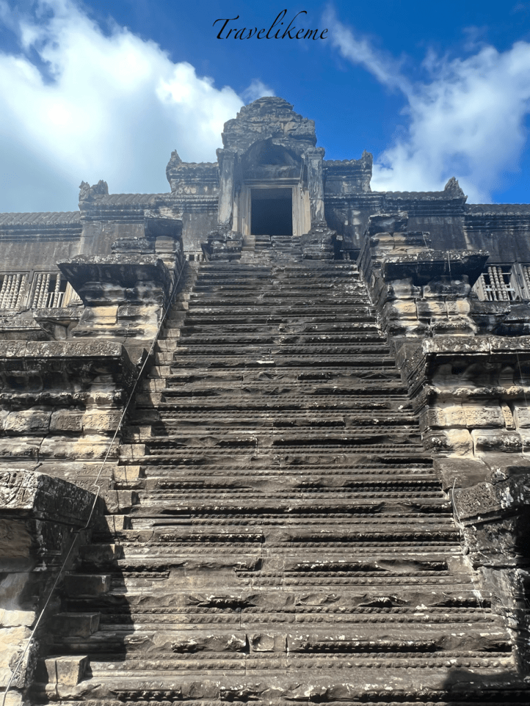 At the centre of the temple stands a quincunx of towers which is the highlight of this visit. But first we have to ascend these perilous, steep and slightly damaged staircase clinging on for dear life at the wire rope secured on the left side of the steps.