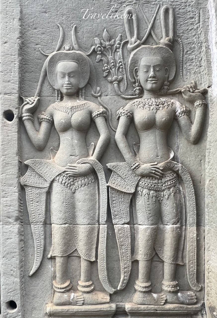Apsaras like this one are also found all over the temple complex. They are a member of a class of celestial beings in Hindu and Buddhist culture. A type of female spirit of the clouds and waters and figure prominently in the sculpture, dance, literature and paintings of many Indian and Southeast Asian cultures.