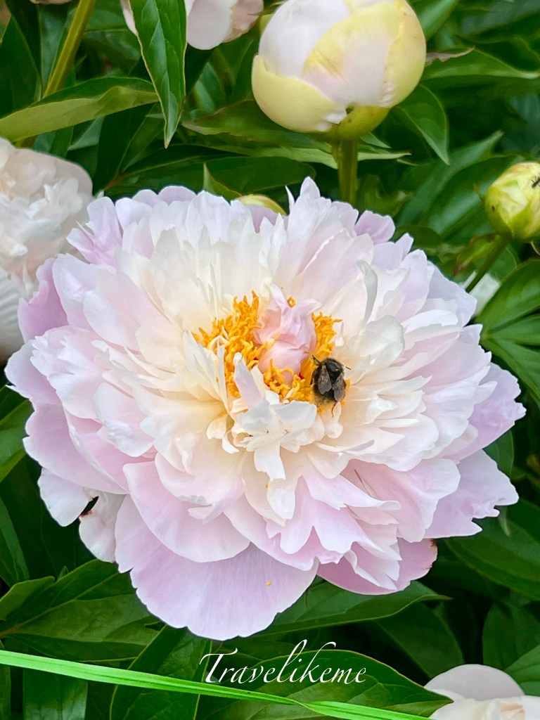 The bee frolics amongst the delicate pink, sweet smelling and multi petalled Peony. The peony shrub can live over 100 years and the cut flowers have a shelf life of over a week in a vase. In floral language, Peonies represent good fortune, happy marriage, riches, honour, compassion and surprisingly, bashfulness.