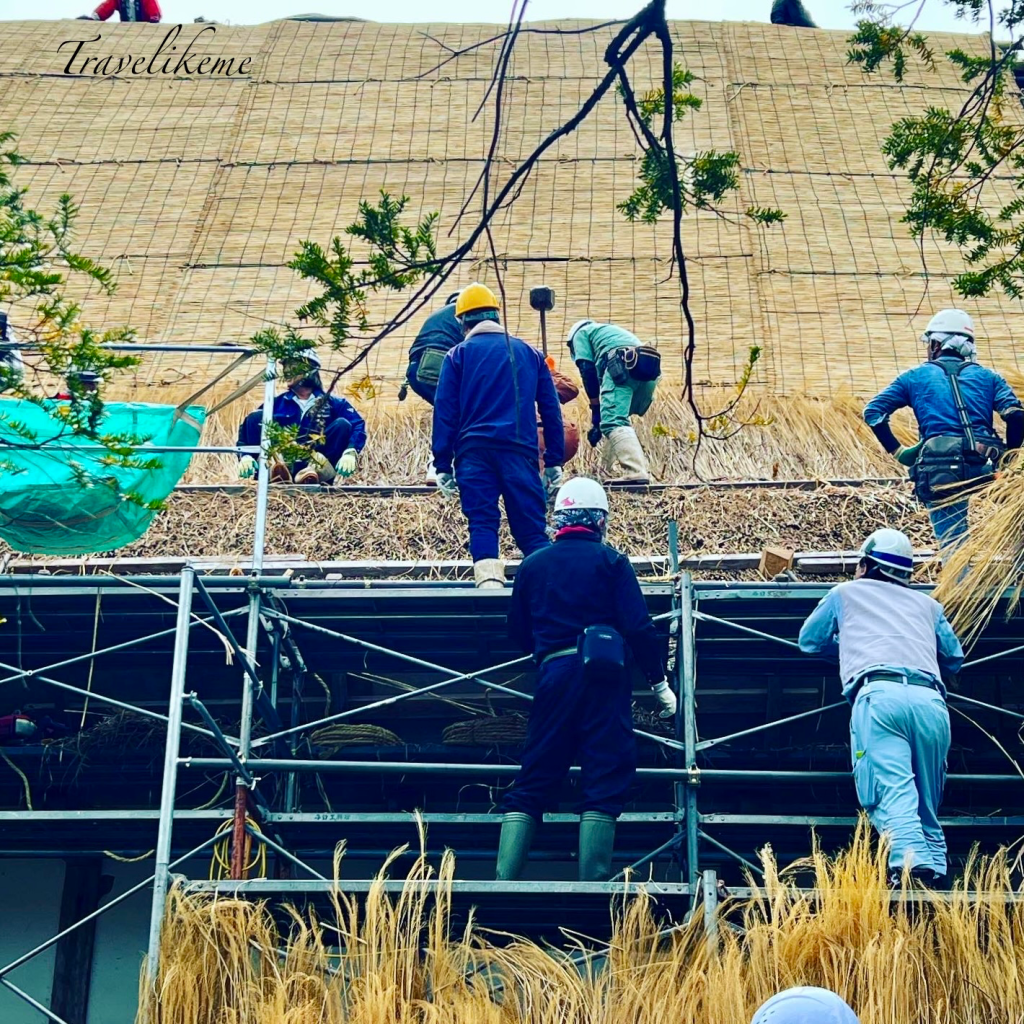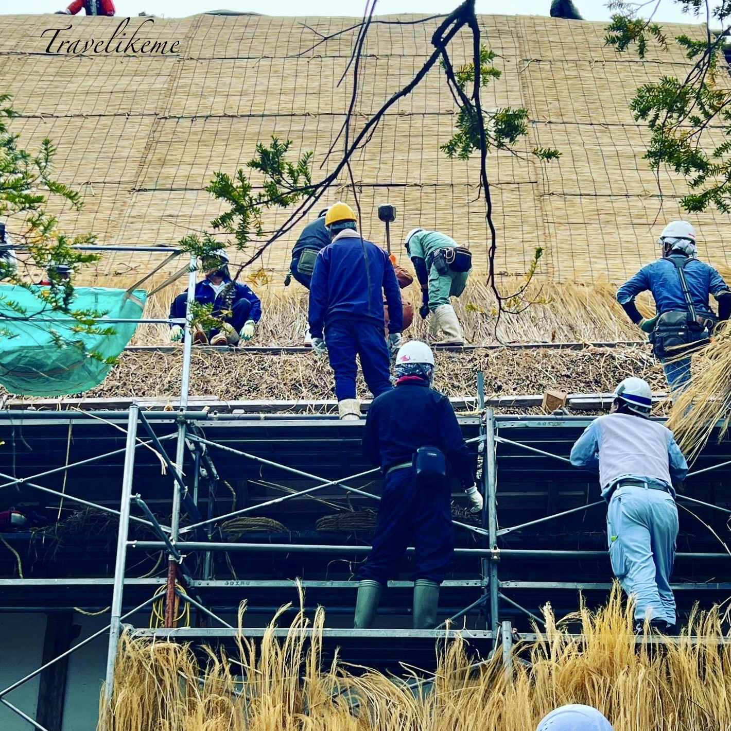 Myozenji Temple Museum was getting a new thatched roof, so I was mesmerised for a good 10-15 mins as I stood there watching the men heave the weaved pampas grass bales up the roof and had them fastened to the roof beams whilst some others were pounding the pampas in the lower reaches to compact them. These thatched roofs have to be replaced after 25 or 30 years and in Shirakawa-go about 4 or 5 thatched roofs are replaced every year.