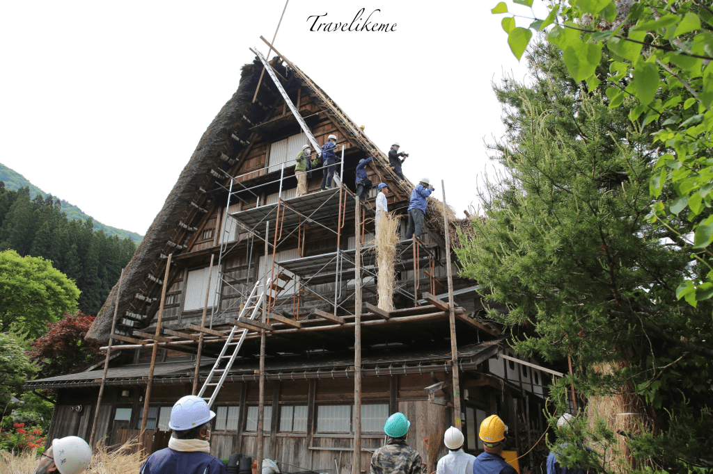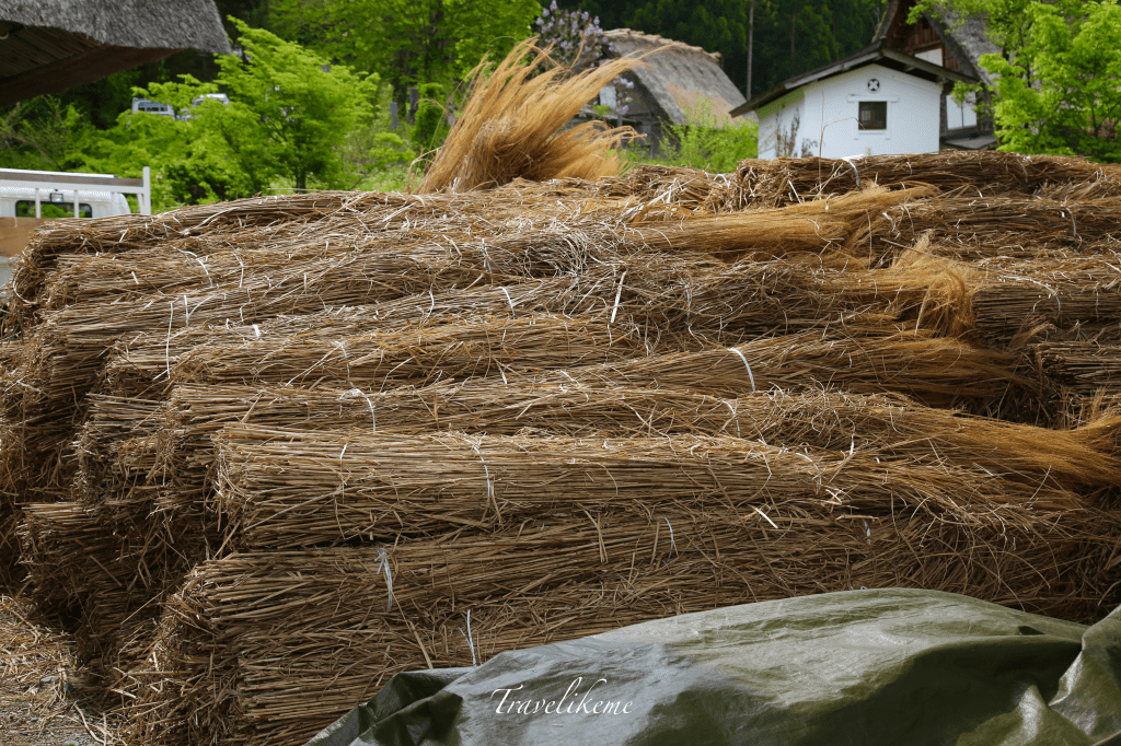 Nearly every year since 1987 the entire student body of Shirakawa Junior High School has helped to harvest the pampas grass for the thatched roofs using carried out in October. They are briefed by a member of the Gassho-style House Preservation Society on how to cut the grass. The 2m high grass is cut at the base and 50 stalks are bound together with rope and are placed standing in bunches of 5.