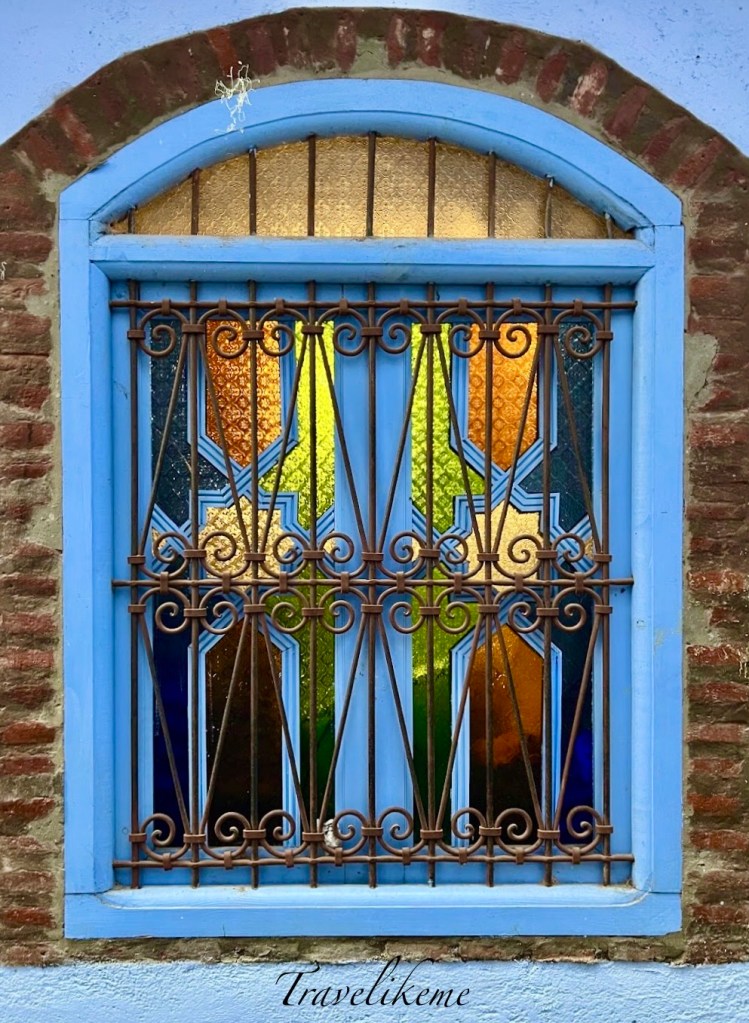 A pretty window with stained glass in Moorish design and the typical wrought iron grills.