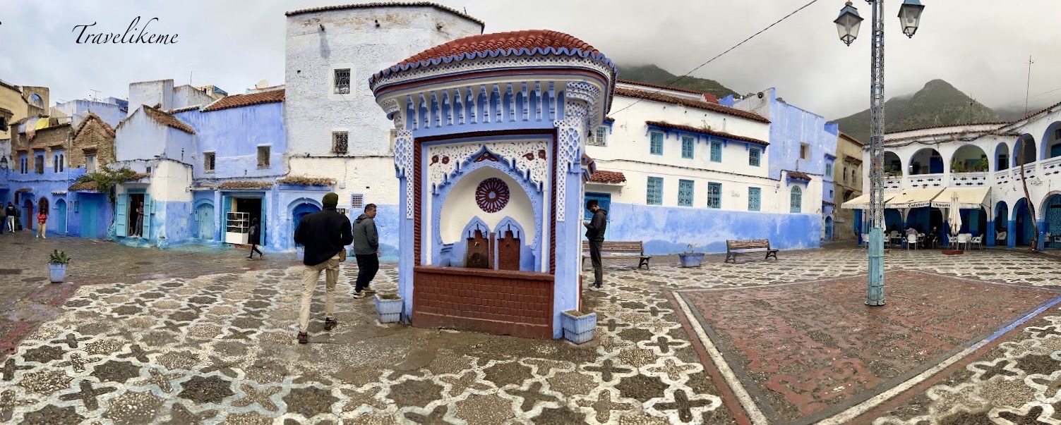 Panoramic view of the picturesque square, Place de la Haouta at Rue Chefchaouen and the pretty 4 sided water fountain where the locals get drinking water. The architecture is unique with mainly blue and white buildings featuring classic arches and iron grills with beautiful patterned flooring. As the name ‘Hawta’ implies ‘surrounded’ or ‘walled in’, this square is encircled by buildings on every side within the Medina.