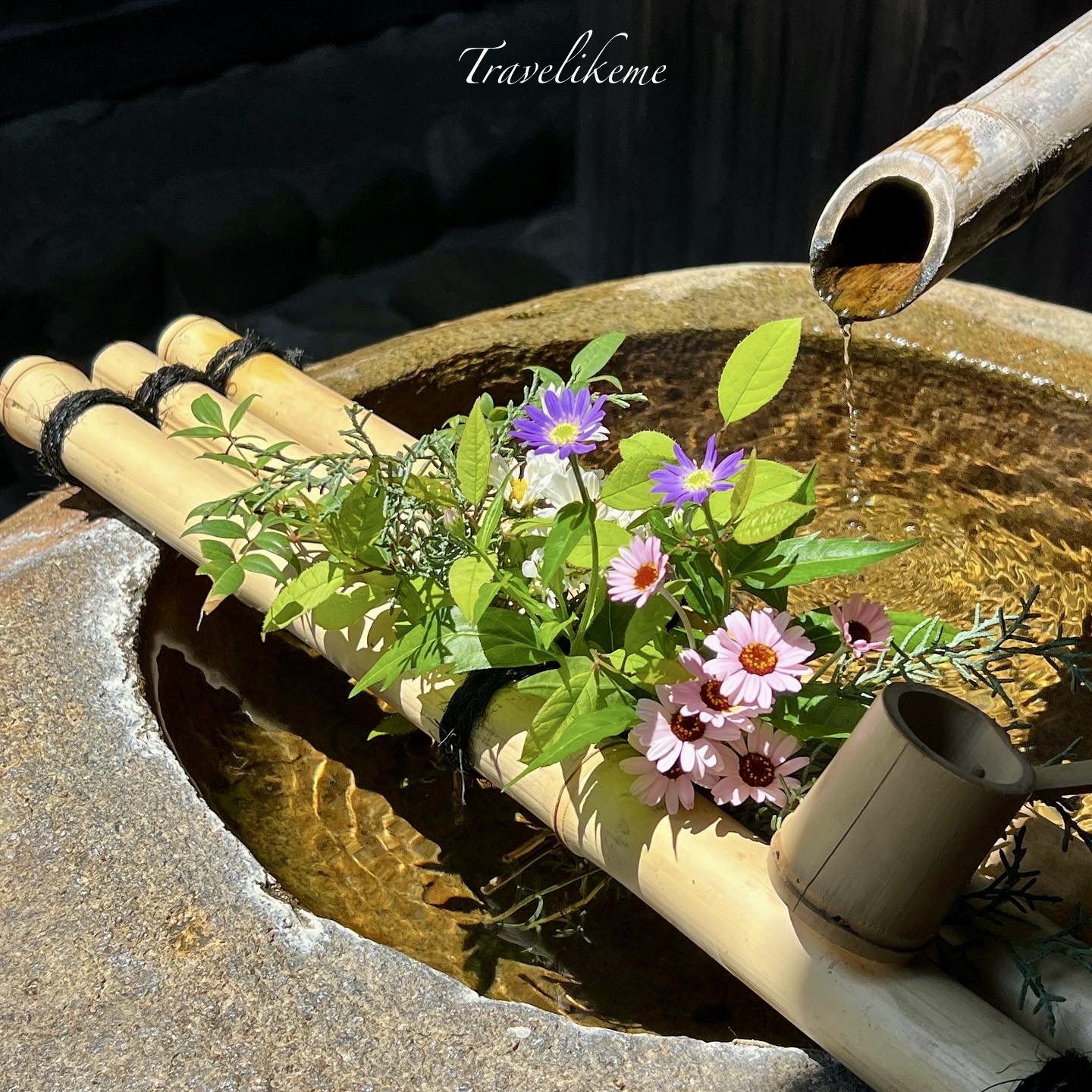Japanese art and craft embodies a simplicity that blends with nature and the surroundings and it is outstanding and beautiful, as seen in this flower arrangement sitting on the bamboo poles straddling a tiny water pond.