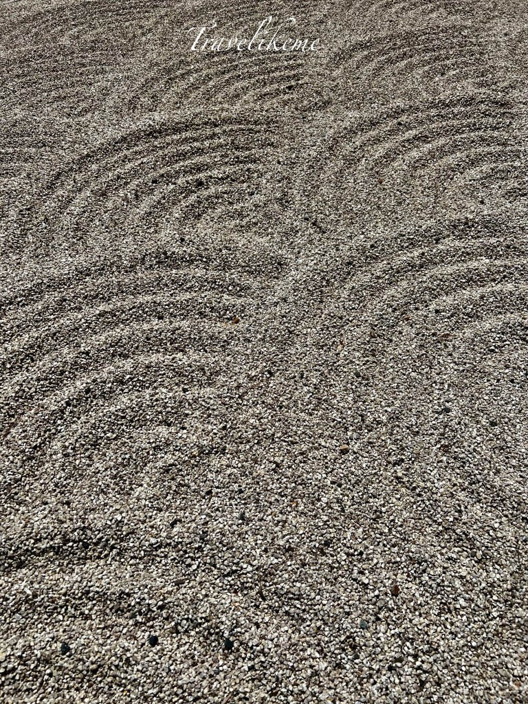 The granite chip gravel in this Zen garden represents water. The monks rake the sand meticulously each day as a form of meditation and the intricate designs fit in with the elements of the rock garden representing the flow of water.