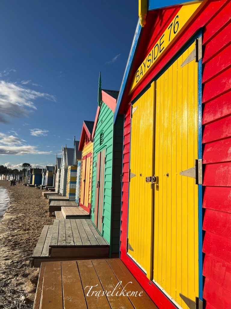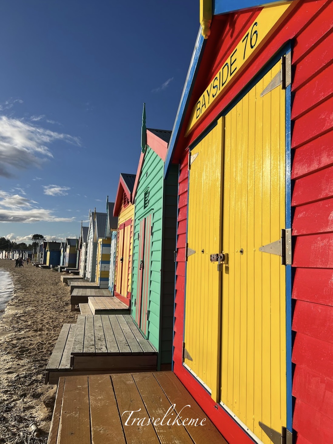The colourful and much photographed iconic 82 Brighton Bathing Boxes in Melbourne, Australia that are unique because of their uniform scale and proportion, building materials and sentry order alignment on Dendy Street beach.