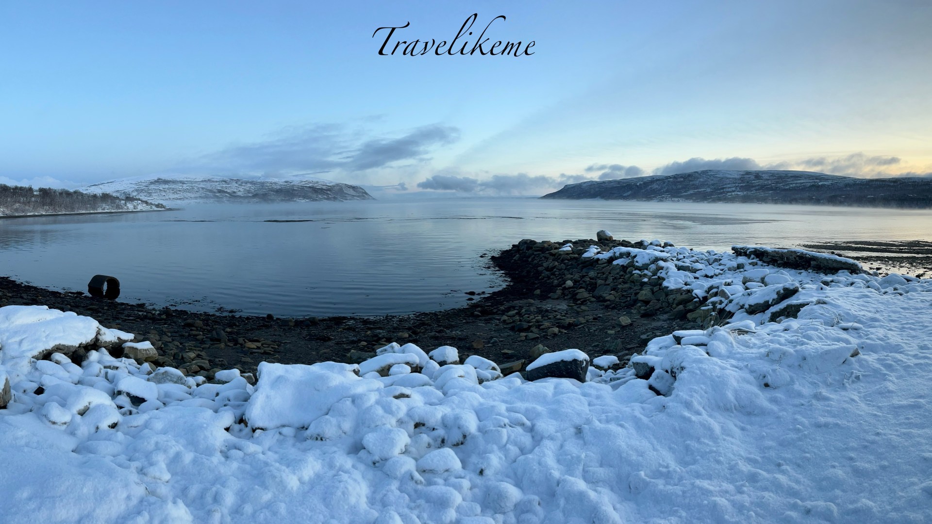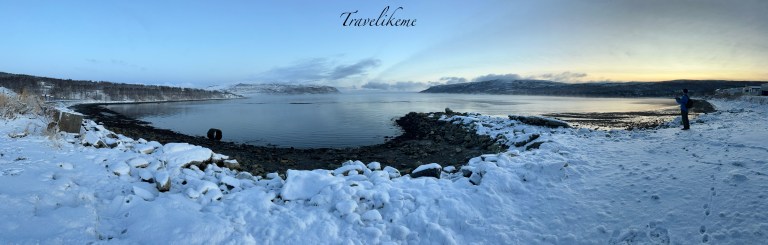 Panoramic shot taken at Russenes in Finnmark County of Norway along the E69 Highway where the Olderfjord Turistsenter AS is situated. Here I am standing at the waters edge of Porsanger Fjord at sunset. This 123km fjord is Norway’s fourth longest and empties out into the Barents Sea.