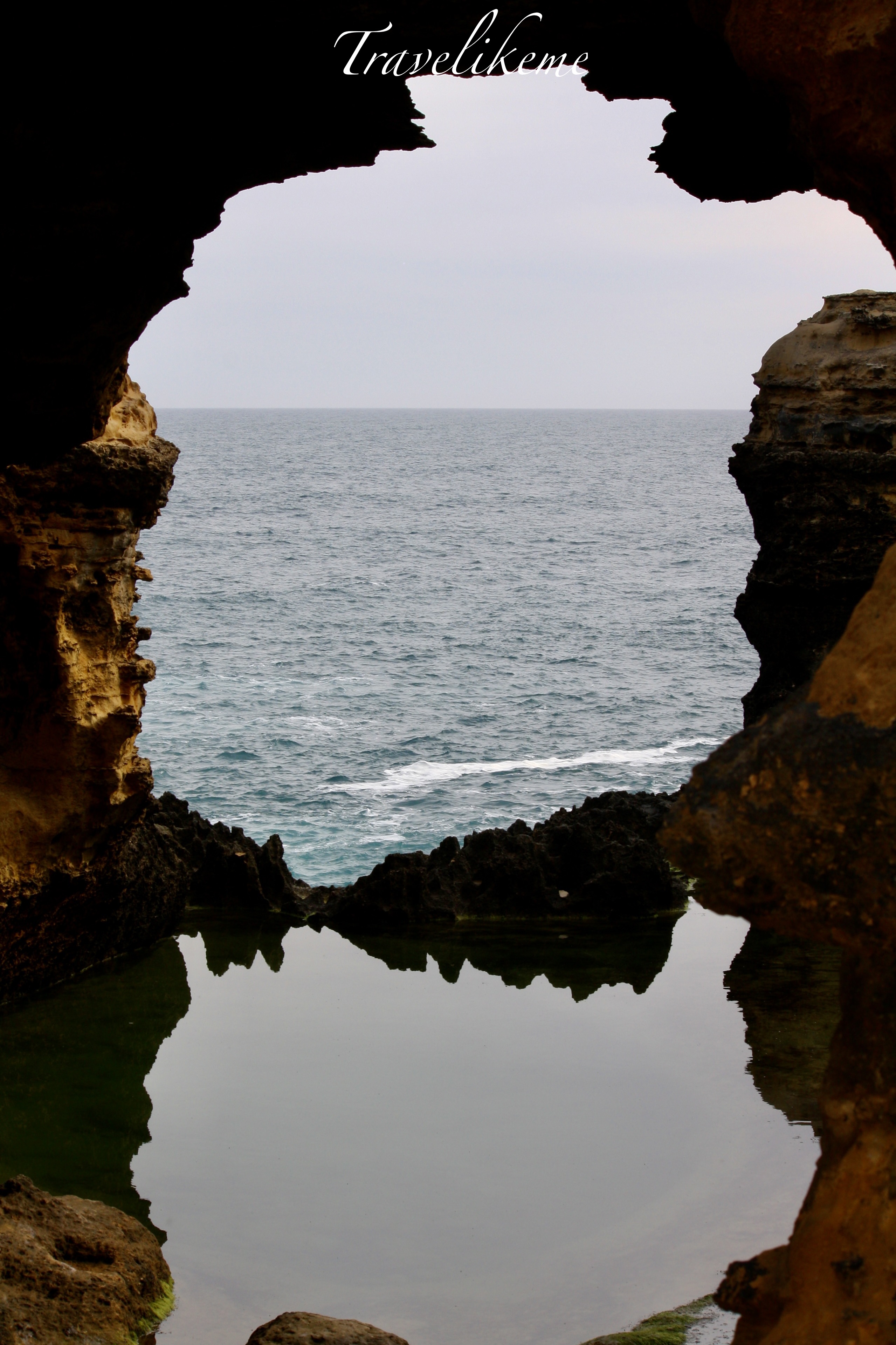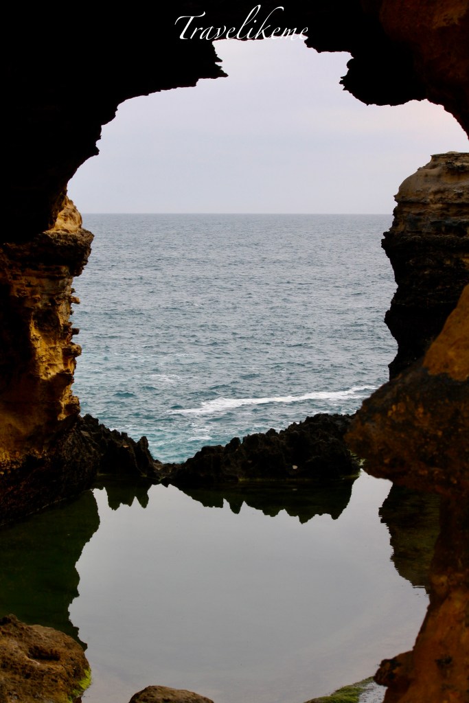 The Grotto is a sinkhole geological formation located at Peterborough along the Great Ocean Road in Victoria, Australia. After descending a few flights of steps, we spy at low tide a pool, a beautiful reflection of the arch and the ocean .