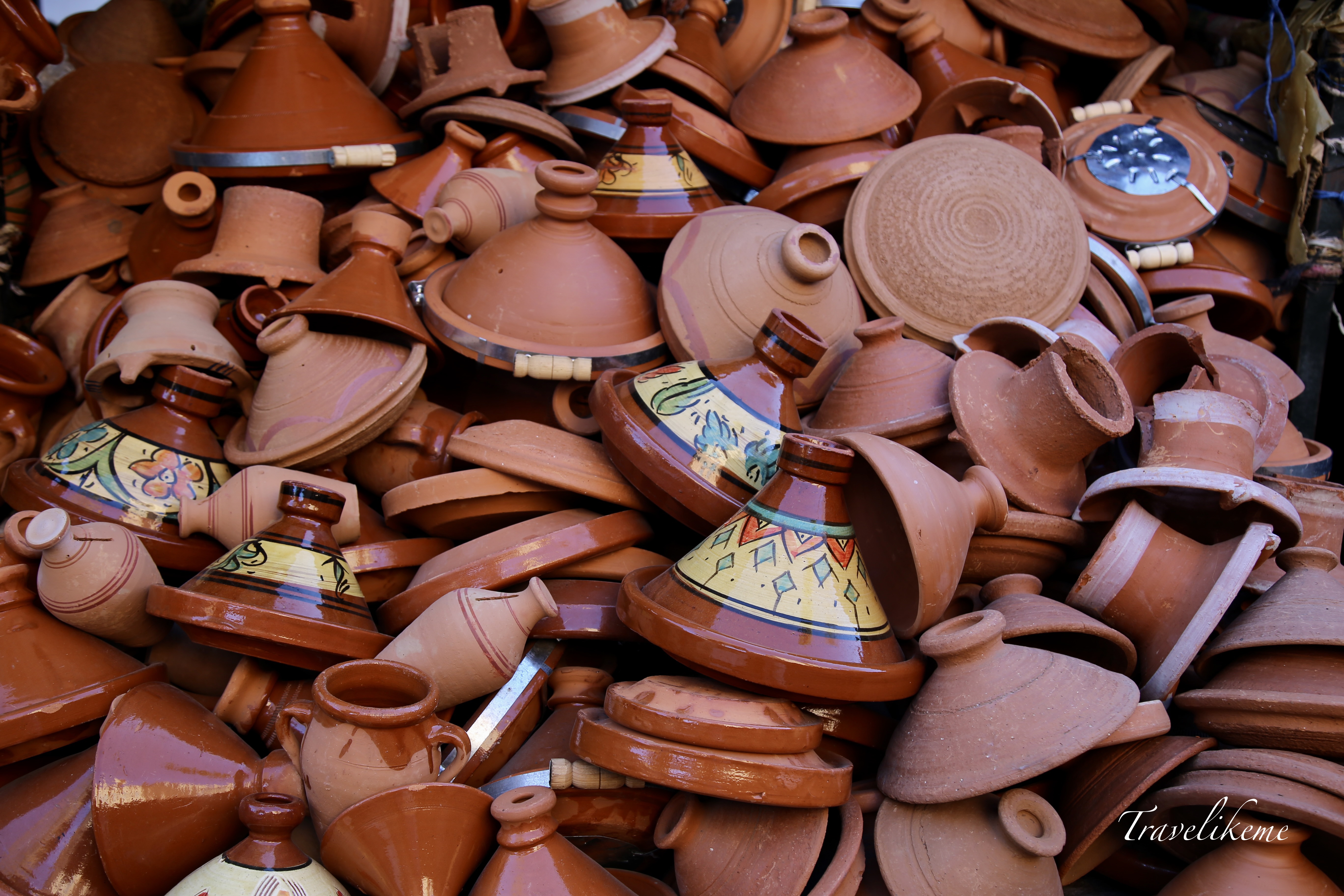 Traditional Tagine pottery which consists of two parts: a circular base unit that is flat with low sides and a large cone or dome shaped cover that sits on the base during cooking. Tagines are cooked slowly over hot charcoal to keep the stew simmering gently and are typically made with meat, poultry or fish together with vegetables and fruit combined with an assortment of spices. Saw this pile of pottery at the Medina of Marrakesh in Morocco.