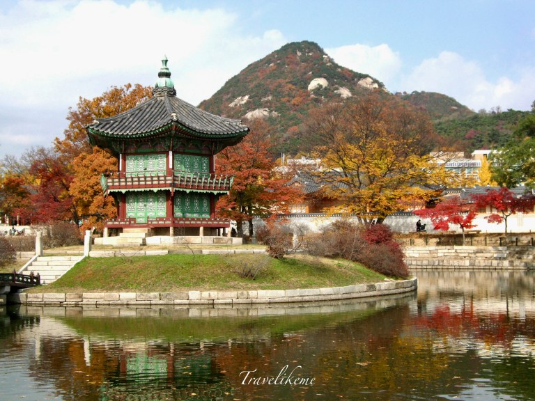 Full autumn colours at the Hyangwonjeong Pavilion “Pavilion of Far-Reaching Fragrance”. This pretty, two storey hexagonal structure was built around 1873 on the order of King Gojong when the Geoncheonggung residence was built to the north within Gyeongbokung Palace in Seoul, South Korea.