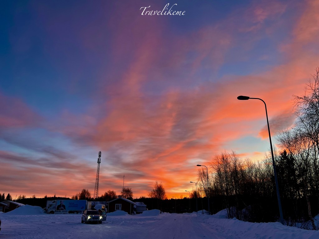 Captivated by the crimson sunset over Inari, Lapland Province in Finland. This is widely known as the capital of Finnish Sami culture. The Lapland region lies above the Arctic Circle so there would be an extended period when the sun ceases to rise above the horizon known as Polar nights which occurs during Winter in both the Arctic and Antarctic. We experienced daylight from about 10.00am to 2pm for about 4 short hours.